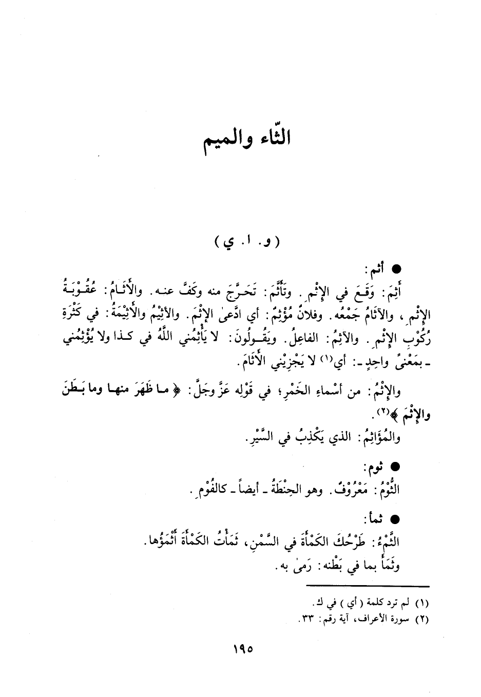 أثم : أَثِمَ : وَقَعَ في الإِثْمِ . وتَأَثَّمَ : تَحَرَّجَ منه وكَفَّ عنه . والأَثَامُ : عُقُوْبَةُ الإِثْمِ ، والآثَامُ جَمْعُه . وفلانٌ مُؤْثِمٌ : أي ادَّعى الإثْمَ . والأثِيْمُ والأَثِيْمَةُ : في كَثْرَةِ رُكُوْبِ الإِثْمِ . والآثِمُ : الفاعِلُ . ويَقُولُونَ : لا يَأْثِمُني اللهُ في كذا ولا يُؤْثِمُني بمَعْنىً واحِدٍ : أي لا يَجْزِيْني الأَثَامَ . والإِثْمُ : من أسْماءِ الخَمْرِ ؛ في قَوْلِه عَزَّ وجَلَّ : ' ما ظَهَرَ منها وما بَطَنَ والإِثْمَ ' . والمُؤَاثِمُ : الذي يَكْذِبُ في السَّيْرِ . ثوم : الثُّوْمُ : مَعْرُوْفٌ . وهو الحِنْطَةُ أيضاً كالفُوْمِ . ثمأ : الثَّمْءُ : طَرْحُكَ الكَمْأَةَ في السَّمْنِ ، ثَمَأْتُ الكَمْأَةَ أَثْمَؤُها . وثَمَأَ بما في بَطْنه : رَمى به .