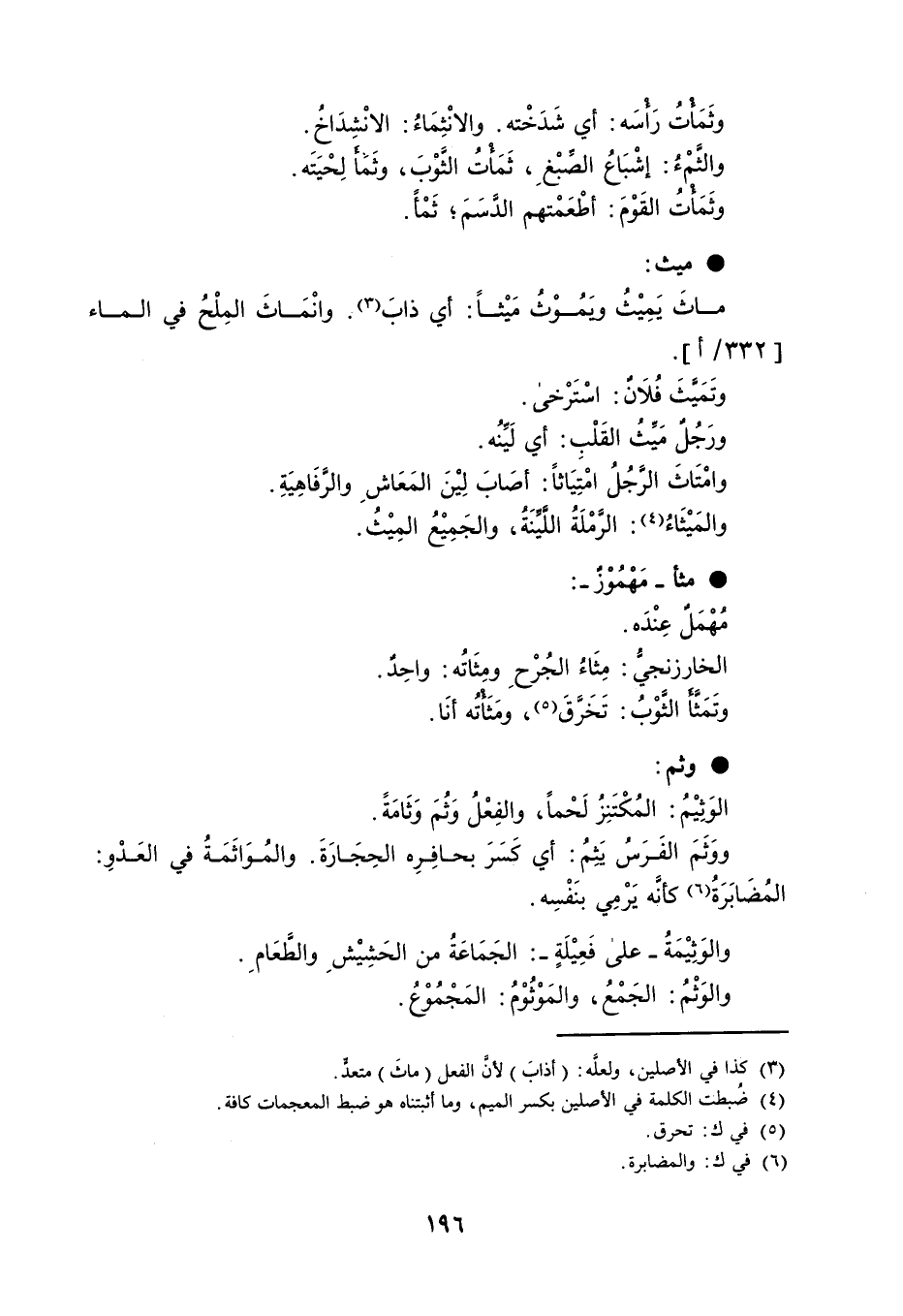 وثَمَأْتُ رَأْسَه : أي شَدَخْته . والانْثِمَاءُ : الانْشِدَاخُ . والثَّمْءُ : إشْبَاعُ الصِّبْغِ ، ثَمَأْتُ الثَّوْبَ ، وثَمَأَ لِحْيَتَه . وثَمَأْتُ القَوْمَ : أطْعَمْتهم الدَّسَمَ ؛ ثَمْأً . ميث : ماثَ يَمِيْثُ ويَمُوْثُ مَيْثاً : أي ذابَ . وانْمَاثَ المِلْحُ في الماء . وتَمَيَّثَ فُلاَنٌ : اسْتَرْخى . ورَجُلٌ مَيِّثُ القَلْبِ : أي لَيِّنُه . وامْتَاثَ الرَّجُلُ امْتِيَاثاً : أصَابَ لِيْنَ المَعَاشِ والرَّفَاهِيَةِ . والمَيْثَاءُ : الرَّمْلَةُ اللَّيِّنَةُ ، والجَمِيْعُ المِيْثُ . مثأ مَهْمُوْزٌ : مُهْمَلٌ عِنْدَه . الخارزنجيُّ : مِثَاءُ الجُرْحِ ومِثَاتُه : واحِدٌ . وتَمَثَّأَ الثَّوْبُ : تَخَرَّقَ ، ومَثَأْتُه أنَا . وثم : الوَثِيْمُ : المُكْتَنِزُ لَحْماً ، والفِعْلُ وَثُمَ وَثَامَةً . ووَثَمَ الفَرَسُ يَثِمُ : أي كَسَرَ بحافِرِه الحِجَارَةَ . والمُوَاثَمَةُ في العَدْوِ : المُضَابَرَةُ كأنَّه يَرْمِي بنَفْسِه . والوَثِيْمَةُ على فَعِيْلَةٍ : الجَمَاعَةُ من الحَشِيْشِ والطَّعَامِ . والوَثْمُ : الجَمْعُ ، والمَوْثُوْمُ : المَجْمُوْعُ .