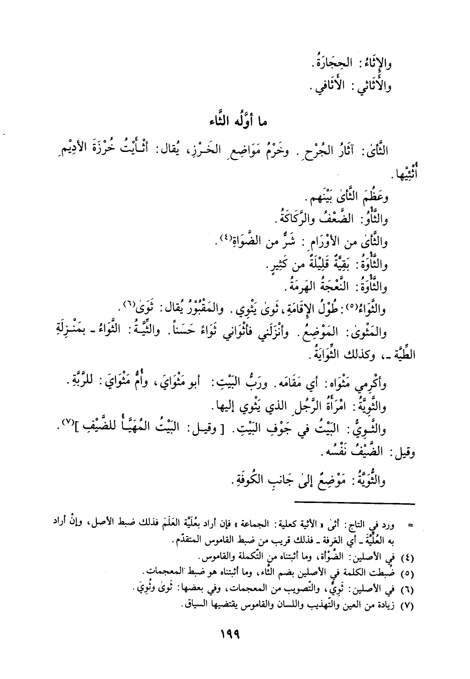 الثَّأى : آثَارُ الجُرْحِ . وخَرْمُ مَوَاضِعِ الخَرْزِ ، يُقال : أثْأَيْتُ خُرْزَةَ الأدِيْمِ أُثْئِيْها . وعَظُمَ الثَّأى بَيْنَهم . والثَّأْوُ : الضَّعْفُ والرَّكَاكَةُ . والثَّأى من الأوْرَامِ : شَرٌّ من الضَّوَاةِ . والثَّأْوَةُ : بَقِيَّةٌ قَلِيْلَةٌ من كَثِيْرٍ . والثَّأْوَةُ : النَّعْجَةُ الهَرمَةُ . والثَّوَاءُ : طُوْلُ الإِقَامَةِ ، ثَوى يَثْوِي . والمَقْبُوْرُ يُقال : ثَوَى . والمَثْوى : المَوْضِعُ . وأنْزَلَني فأثْوَاني ثَوَاءً حَسَناً . والثِّيَّةُ : الثَّوَاءُ بِمَنْزِلَةِ الطِّيَّة ، وكذلك الثِّوَايَةُ . وأكْرِمي مَثْوَاه : اي مَقَامَه . ورَبُّ البَيْتِ : أبو مَثْوَايَ ، وأُمّث مَثْوَايَ : للرَّبَّةِ . والثَّوِيَّةُ : امْرَأَةُ الرَّجُلِ الذي يَثْوي إليها . والثَّوِيُّ : البَيْتُ في جَوْفِ البَيْتِ . وقيل : البَيْتُ المُهَيَّأُ للضَّيْفِ . وقيل : الضَّيْفُ نَفْسُه . والثُّوَيَّةُ : مَوْضِعٌ إلى جَانبِ الكُوفَةِ .