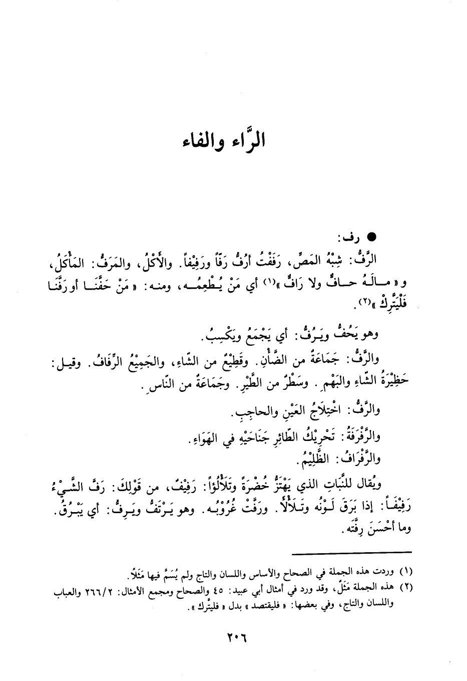 رف : الرَّفُّ : شِبْهُ المَصِّ ، رَفَفْتُ أرُفُّ رَفّاً ورَفِيْفاً . والأَكْلُ ، والمَرَفُّ : المَأْكَلُ ، و ' مالَهُ حافٌّ ولا رَافٌّ ' أي مَنْ يُطْعِمُه ، ومنه : ' مَنْ حَفَّنَا أو رَفَّنَا فَلْيَتَّرِكْ ' . وهو يَحُفُّ ويَرُفُّ : أي يَجْمَعُ ويَكْسِبُ . والرَّفُّ : جَمَاعَةٌ من الضَّأْنِ . وقَطِيْعٌ من الشّاءِ ، والجَمِيْعُ الرِّفَافُ . وقيل : حَظِيْرَةُ الشّاءِ والبَهْمِ . وسَطُرٌ من الطَّيْرِ . وجَمَاعَةٌ من النّاسِ . والرّفُّ : اخْتِلاَجُ العَيْنِ والحاجِبِ . والرَّفْرَفَةُ تَحْرِيْكُ الطّائِرِ جَنَاحَيْهِ في الهَوَاءِ . والرَّفْرَافُ : الظَّلِيْمُ . ويُقال للنَّبَاتِ الذي يَهْتَزُّ خُضْرَةً وتَلأْلُؤاً : رَفِيْفٌ ، من قَوْلِكَ : رَفَّ الشَّيْءُ رَفِيْفَاً : إذا بَرَقَ لَوْنُه وتَلأْلأَ . ورَفَّتْ غُرُوْبُه . وهو يَرْتَفُّ ويَرِفُّ : أي يَبْرُقُ . وما أحْسَنَ رِفَّتَه .