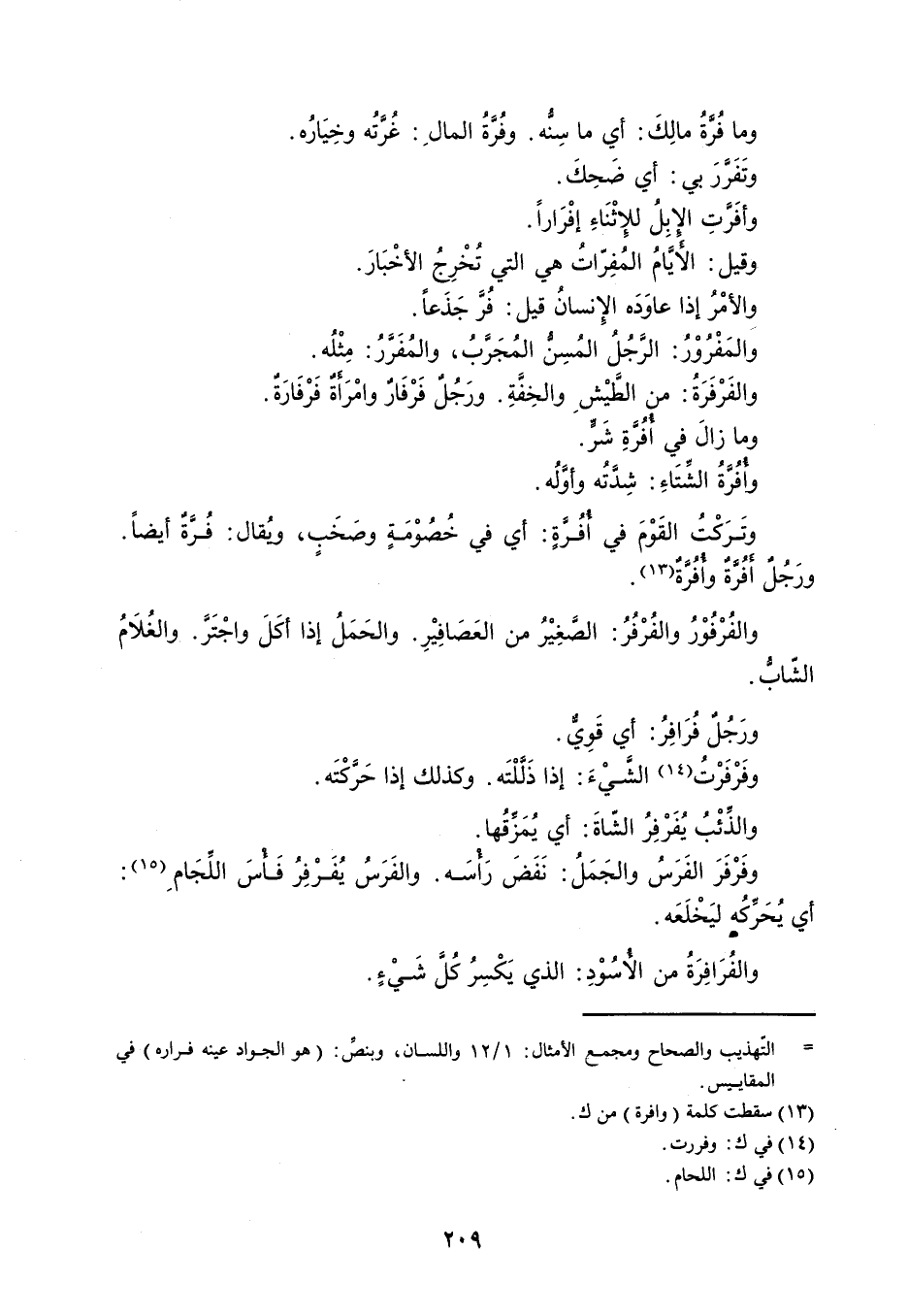 وما فُرَّةُ مالِكَ : أي ما سِنُّه . وفُرَّةُ المالِ : غُرَّتُه وخِيَارُه . وتَفَرَّرَ بي : أي ضَحِكَ . وأفَرَّتِ الإِبِلُ للإِثْنَاءِ إفْرَاراً . وقيل : الأَيَّامُ المُفِرّاتُ هي التي تُخْرِجُ الأخْبَارَ . والأمْرُ إذا عاوَدَه الإِنسانُ قيل : فُرَّ جَذَعاً . والمَفْرُوْرُ : الرَّجُلُ المُسِنُّ المُجَرَّبُ ، والمُفَرَّرُ : مِثْلُه . والفَرْفَرَةُ : من الطَّيْشِ والخِفَّةِ . ورَجُلٌ فَرْفَارٌ وامرَأَةٌ فَرْفَارَةٌ . وما زالَ في أُفُرَّةِ شَرٍّ . وأُفُرَّةُ الشِّتَاءِ : شِدَّتُه وأوَّلُه . وتَرَكْتُ القَوْمَ في أُفُرَّةٍ : أي في خُصُوْمَةٍ وصَخَبٍ ، ويُقال : فُرَّةٌ أيضاً . ورَجُلٌ أَفُرَّةٌ وأُفُرَّةٌ . والفُرْفُوْرُ والفُرْفُرُ : الصَّغِيْرُ من العَصَافِيْرِ . والحَمَلُ إذا أكَلَ واجْتَرَّ . والغُلاَمُ الشّابُّ . ورَجُلٌ فُرَافِرُ : أي قَوِيٌّ . وفَرْفَرْتُ الشَّيْءَ : إذا ذَلَّلْتَه . وكذلك إذا حَرَّكْتَه . والذِّئْبُ يُفَرْفِرُ الشّاةَ : أي يُمَزِّقُها . وفَرْفَرَ الفَرَسُ والجَمَلُ : نَفَضَ رَأْسَه . والفَرَسُ يُفَرْفِرُ فَأْسَ اللِّجَامِ : أي يُحَرِّكُه ليَخْلَعَه . والفُرَافِرَةُ من الأُسُوْدِ : الذي يَكْسِرُ كُلَّ شَيْءٍ .