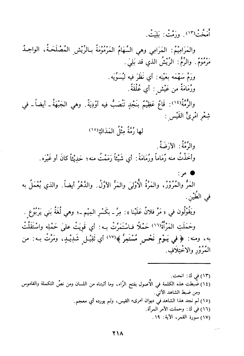 أَمَخَّتْ . ورَمَّتْ : بَلِيَتْ . والمَرَامِيْمُ : المَرَامِي وهي السِّهَامُ المَرْمُوْمَةُ بالرِّيْشِ المُصْلَحَةُ ، الواحِدُ مَرْمُوْمٌ . والرِّمُّ : الرِّيْشُ الذي قد بَلِيَ . ورَمَّ سَهْمَه بعَيْنِه : أي نَظَرَ فيه ليُسَوِّيَه . ورُمَامَةٌ من عَيْشٍ : أي عُلْقَةٌ . والرُّمَّةُ : قَاعٌ عَظِيْمٌ بنَجْدٍ تَنْصَبُّ فيه أوْدِيَةٌ . وهي الجَبْهَةُ أيضاً في شِعْرِ امْرِىءِ القَيْسِ : لها رُمَّةٌ مِثْلُ المَدَاكِ والرِّمَّةُ : الأرَضَةُ . وأخَذْتُ منه رُمَاماً ورُمَامَةً : أي شَيْئاً رَمَمْتُ منه ؛ حَدِيْثاً كانَ أو غَيْرَه . مر : المَرُّ والمُرُوْرُ ، والمَرَّةُ الأُوْلى والمَرُّ الأوَّلُ . والدَّهْرُ أيضاً . والذي يُعْمَلُ به في الطِّيْنِ . ويَقُوْلُون في ' مَرَّ فلانٌ عَلَيْنا ' : مِرَّ بكَسْرِ المِيْم ؛ وهي لُغَةُ بَني يَرْبُوْعٍ . وحَمَلَتِ المَرْأَةُ حَمْلاً فاسْتَمَرَّتْ به : أي قَوِيَتْ على حَمْلِه واسْتَقَلَّتْ به ، ومنه : ' في يَوْمِ نَحْسٍ مُسْتَمِرٍّ ' أي ثَقِيْلٍ شَدِيْدٍ ، ومَرَّتْ به : من المُرُوْرِ والاخْتِلاَفِ .