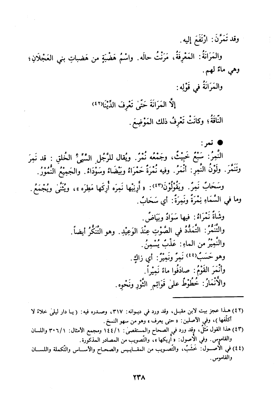 وقد تَمَرَّنَ : ارْتَفَعَ إليه . والمَرَانَةُ : المَعْرِفَةُ ، مَرَنْتُ حالَه . واسْمُ هَضْبَةٍ من هَضباتِ بني العَجْلاَنِ ؛ وهي ماءٌ لهم . والمَرَانَةُ في قَوْلِه : إلاَّ المَرَانَةَ حَتّى تَعْرِفَ الدِّيْنَا النّاقَةُ ؛ وكانَتْ تَعْرِفُ ذلك المَوْضِعَ . نمر : النَّمِرُ : سَبْعٌ خَبِيْثٌ ، وجَمْعُه نَمْرٌ . ويُقال للرَّجُلِ السَّيِّيءِ الخُلقِ : قد نَمِرَ وتَنَمَّرَ . ولَوْنُ النَّمِرِ : أنْمَرُ . وفيه نُمْرَةٌ حَمْرَاءُ وبَيْضَاءُ وسَوْدَاءُ . والجَمِيْعُ النُّمُوْرُ . وسَحَابٌ نَمِرٌ . ويَقُوْلُوْنَ : ' أَرِنِيْها نَمِرَه أُرِكَها مَطِرَه ' ، ويُثَنَّى ويُجْمَعُ . وما في السَّمَاءِ نِمْرَةٌ ونَمِرَةٌ : أي سَحَابٌ . وشَاةٌ نَمْرَاءُ : فيها سَوَادٌ وبَيَاضٌ . والتَّنَمُّرُ : التَّمَدُّدُ في الصَّوْتِ عِنْدَ الوَعِيْدِ . وهو التَّنَكُّرُ أيضاً . والنَّمِيْرُ من الماءِ : عَذْبٌ يُسْمِنُ . وهو حَسَبٌ نَمِرٌ ونَمِيْرٌ : أي زاكٍ . وأنْمَرَ القَوْمُ : صادَفُوا ماءً نَمِيْراً . والأَنْمَارُ : خُطُوْطٌ على قَوَائِمِ الثَّوْرِ ونَحْوِه .