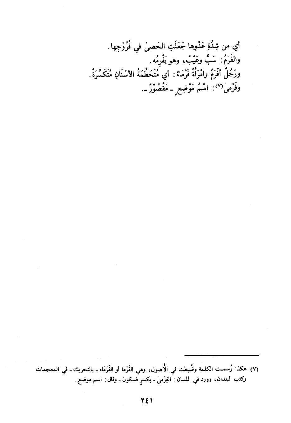أي من شِدَّةِ عَدْوِها جَعَلَتِ الحَصى في فُرُوْجِها . والفَرَمُ : سَبٌّ وعَيْبٌ ، وهو يَفْرِمُه . ورَجُلٌ أفْرَمُ وامْرَأَةٌ فَرْمَاءُ : أي مُتَحَطِّمَةُ الأسْنَانِ مُتَكَسِّرَةٌ . وفَرْمى : اسْمُ مَوْضِعٍ مَقْصُوْرٌ .