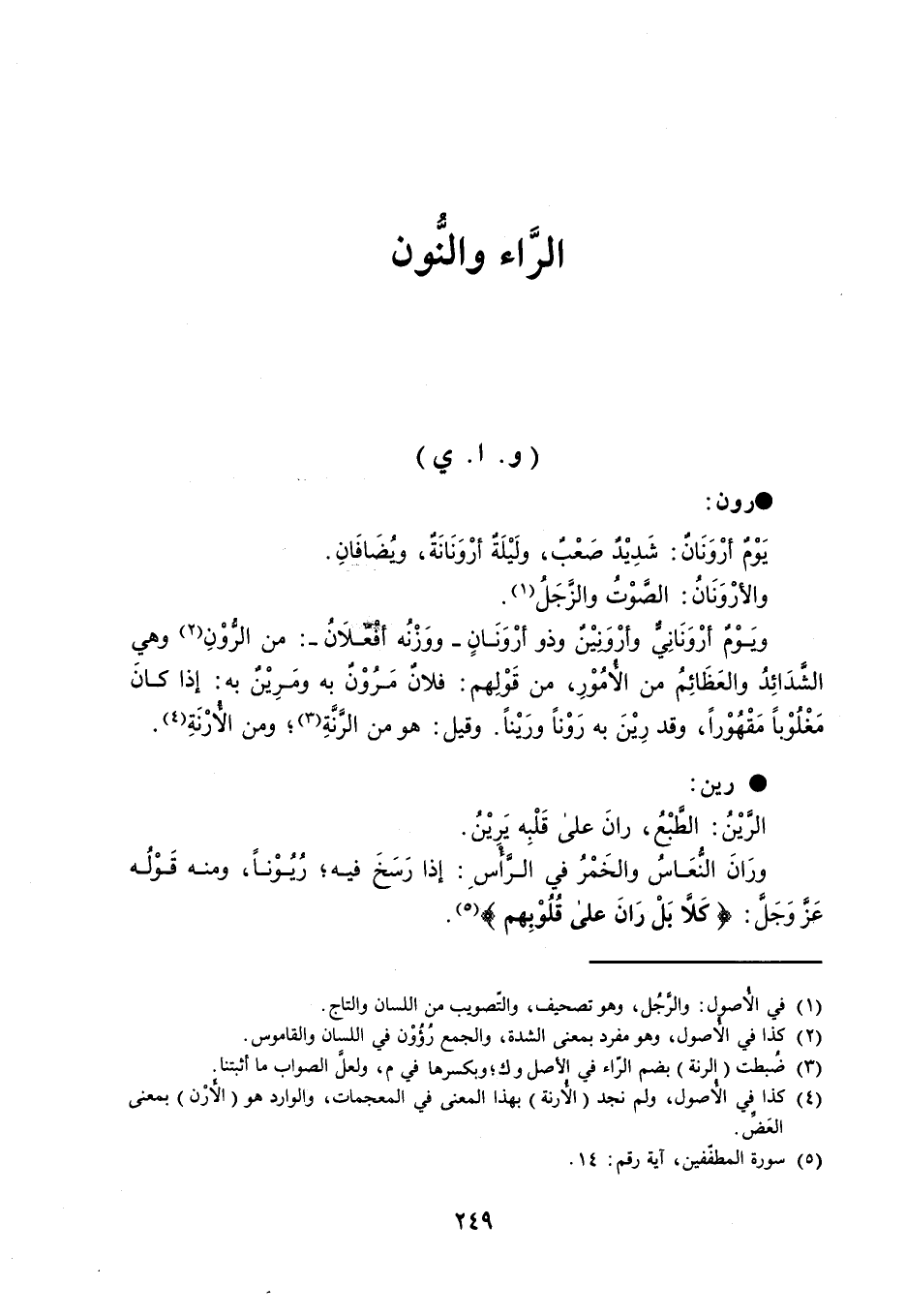 رون : يَوْمٌ أرْوَنَانٌ : شَدِيْدٌ صَعْبٌ ، ولَيْلَةٌ أرْوَنَانَةٌ ، ويُضَافَانِ . والأرْوَنَانُ : الصَّوْتُ والزَّجَلُ . ويَوْمٌ أرْوَنَانِيٌّ وأرْوَنِيْنٌ وذو أرْوَنَانٍ ووَزْنُه أفْعَلاَنُ : من الرُّوْنِ وهي الشَّدَائِدُ والعَظَائِمُ من الأُمُوْرِ ، من قَوْلِهم : فلانٌ مَرُوْنٌ به ومَرِيْنٌ به : إذا كانَ مَغْلُوْباً مَقْهُوْراً ، وقد رِيْنَ به رَوْناً ورَيْناً . وقيل : هو من الرَّنَّةِ ؛ ومن الأُرْنَةِ . رين : الرَّيْنُ : الطَّبْعُ ، رانَ على قَلْبِه يَرِيْنُ . ورَانَ النُّعَاسُ والخَمْرُ في الرَّأْسِ : إذا رَسَخَ فيه ؛ رُيُوْناً ، ومنه قَوْلُه عَزَّ وَجَلَّ : ' كَلاَّ بَلْ رَانَ على قُلُوْبِهم ' .
