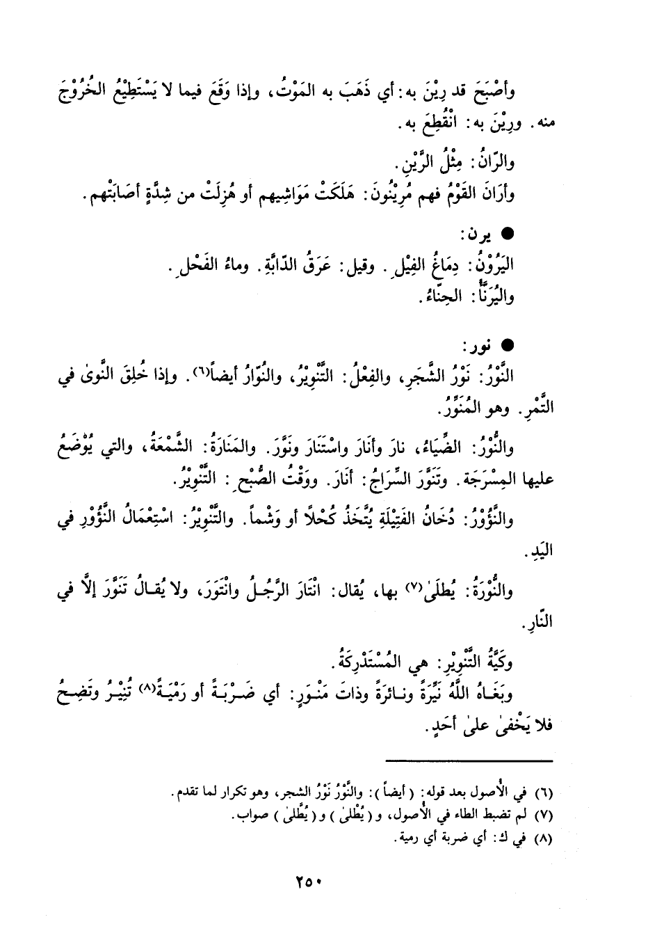 وأصْبَحَ قد رِيْنَ به : أي ذَهَبَ به المَوْتُ ، وإذا وَقَعَ فيما لا يَسْتَطِيْعُ الخُرُوْجَ منه . ورِيْنَ به : انْقُطِعَ به . والرّانُ : مِثْلُ الرَّيْنِ . وأرَانَ القَوْمُ فهم مُرِيْنُونَ : هَلَكَتْ مَوَاشِيهم أو هُزِلَتْ من شِدَّةٍ أصَابَتْهم . يرن : اليَرُوْنُ : دِمَاغُ الفِيْلِ . وقيل : عَرَقُ الدّابَّةِ . وماءُ الفَحْلِ . واليُرَنَّأُ : الحِنّاءُ . نور : النَّوْرُ : نَوْرُ الشَّجَرِ ، والفِعْلُ : التَّنْوِيْرُ ، والنُوّارُ أيضاً . وإذا خُلِقَ النَّوى في التَّمْرِ وهو المُنَوّرُ . والنُّوْرُ : الضِّيَاءُ ، نارَ وأنَارَ واسْتَنَارَ ونَوَّرَ . والمَنَارَةُ : الشَّمْعَةُ ، والتي يُوْضَعُ عليها المِسْرَجَة . وتَنَوَّرَ السِّرَاجُ : أنَارَ . ووَقْتُ الصُّبْحِ : التَّنْوِيْرُ . والنَّؤُوْرُ : دُخَانُ الفَتِيْلَةِ يُتَّخَذُ كُحْلاً أو وَشْماً . والتَّنْوِيْرُ : اسْتِعْمَالُ النَّؤُوْرِ في اليَدِ . والنُّوْرَةُ : يُطلَى بها ، يُقال : انْتَارَ الرَّجُلُ وانْتَوَرَ ، ولا يُقالُ تَنَوَّرَ إلاَّ في النّارِ . وكَيَّةُ التَّنْوِيْرِ : هي المُسْتَدْرِكَةُ . وبَغَاهُ اللهُ نَيِّرَةً ونائرَةً وذاتَ مَنْوَرٍ : أي ضَرْبَةً أو رَمْيَةً تُنِيْرُ وتَضِحُ فلا يَخْفى على أحَدٍ .