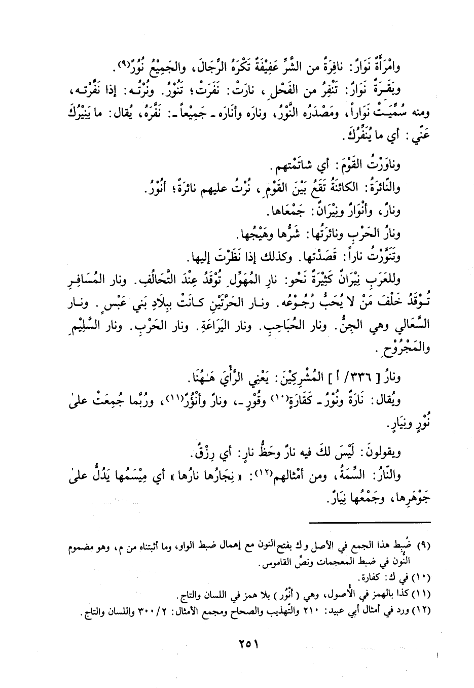 وامْرَأَةٌ نَوَارٌ : نافِرَةٌ من الشَّرِّ عَفِيْفَةٌ تَكْرَهُ الرِّجَالَ ، والجَمِيْعُ نُوُرٌ . وبَقَرَةٌ نَوَارٌ : تَنْفِرُ من الفَحْلِ ، نارَتْ : نَفَرَتْ ؛ تَنُوْرُ . ونُرْتُه : إذا نَفَّرْته ، ومنه سُمِّيَتْ نَوَاراً ، ومَصْدَرُه النَّوْرُ ، ونارَه وأنَارَه جَمِيْعاً : نَفَّرَهُ ، يُقال : ما يَنِيْرُكَ عَنّي : أي ما يُنَفِّرُكَ . وناوَرْتُ القَوْمَ : أي شاتَمْتهم . والنّائرَةُ : الكائنَةُ تَقَعُ بَيْنَ القَوْمِ ، نُرْتُ عليهم نائرَةً ؛ أنُوْرُ . ونارٌ ، وأنْوَارٌ ونِيْرَانٌ : جَمْعَاها . ونارُ الحَرْبِ ونائرَتُها : شَرُّها وهَيْجُها . وتَنَوَّرْتُ ناراً : قَصَدْتها . وكذلك إذا نَظَرْتَ إليها . وللعَرَبِ نِيْرَانٌ كَثِيْرَةٌ نَحْو : نارِ المُهَوِّلِ تُوْقَدُ عِنْدَ التَّحَالُفِ . ونار المُسَافِرِ تُوْقَدُ خَلْفَ مَنْ لا يُحَبُّ رُجُوْعُه . ونار الحَرَّتَيْنِ كانَتْ ببِلاَدِ بَني عَبْسٍ . ونار السَّعَالي وهي الجِنُّ . ونار الحُبَاحِبِ . ونار اليَرَاعَةِ . ونار الحَرْبِ . ونار السَّلِيْمِ والمَجْرُوْحِ . ونارُ المُشْرِكِيْنَ : يَعْنِي الرَّأْيَ هَهُنَا . ويُقال : نَارَةٌ ونُوْرٌ كَفَارَةٍ وقُوْرٍ ، ونارٌ وأنْؤُرٌ ، ورُبَّما جُمِعَتْ على نُوْرٍ ونِيَارٍ . ويقولونَ : لَيْسَ لكَ فيه نارٌ وحَظُّ نارٍ : أي رِزْقٌ . والنّارُ : السِّمَةُ ، ومن أمْثالهم : ' نِجَارُها نارُها ' أي مِيْسَمُها يَدُلُّ على جَوْهَرِها ، وجَمْعُها نِيَارٌ .