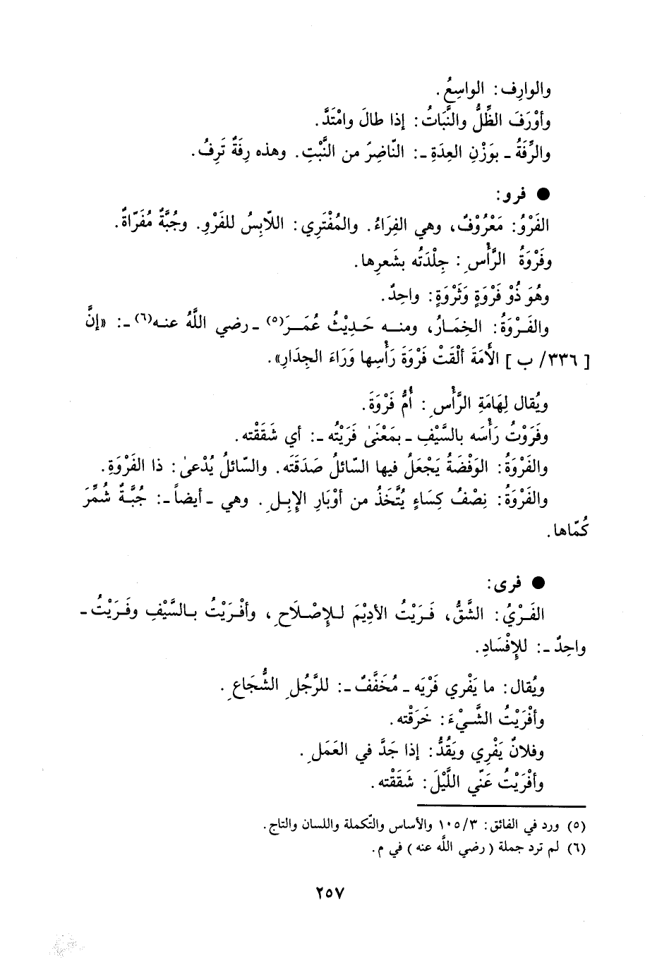 والوارِف : الواسِعُ . وأوْرَفَ الظِّلُّ والنَّبَاتُ : إذا طالَ وامْتَدَّ . والرِّفَةُ بوَزْنِ العِدَةِ : النّاضِرَ من النَّبْتِ . وهذه رِفَةٌ تَرِفُ . فرو : الفَرْوُ : مَعْرُوْفٌ ، وهي الفِرَاءُ . والمُفْتَرِي : اللاّبِسُ للفَرْوِ . وجُبَّةٌ مُفَرّاةٌ . وفَرْوَةُ الرَّأْسِ : جِلْدَتُه بشَعرِها . وهُوَ ذُوْ فَرْوَةٍ وَثَرْوَةٍ : واحِدٌ . والفَرْوَةُ : الخِمَارُ ، ومنه حَدِيْثُ عُمَرَ رضي اللهُ عنه : ' إنَّ الأَمَةَ ألْقَتْ فَرْوَةَ رَأْسِها وَرَاءَ الجِدَارِ ' . ويُقال لِهَامَةِ الرَّأْسِ : أُمُّ فَرْوَةَ . وفَرَوْتُ رَأْسَه بالسَّيْفِ بمَعْنَى فَرَيْتُه : أي شَقَقْته . والفَرْوَةُ : الوَفْضَةُ يَجْعَلُ فيها السّائلُ صَدَقَتَه . والسّائلُ يُدْعى : ذا الفَرْوَةِ . والفَرْوَةُ : نِصْفُ كِسَاءٍ يُتّخَذُ من أوْبَارِ الإِبِلِ . وهي أيضاً : جُبَّةٌ شُمِّرَ كُمّاها . فرى : الفَرْيُ : الشَّقُّ ، فَرَيْتُ الأدِيْمَ للإِصْلاَحِ ، وأفْرَيْتُ بالسَّيْفِ وفَرَيْتُ واحِدٌ : للإِفْسَادِ . ويُقال : ما يَفْري فَرْيَه مُصَفَّفٌ : للرَّجُلِ الشُّجَاعِ . وأفْرَيْتُ الشَّيْءَ : خَرَقْته . وفلانٌ يَفْرِي ويَقُدُّ : إذا جَدَّ في العَمَلِ . وأفْرَيْتُ عَنّي اللَّيْلَ : شَقَقْته .