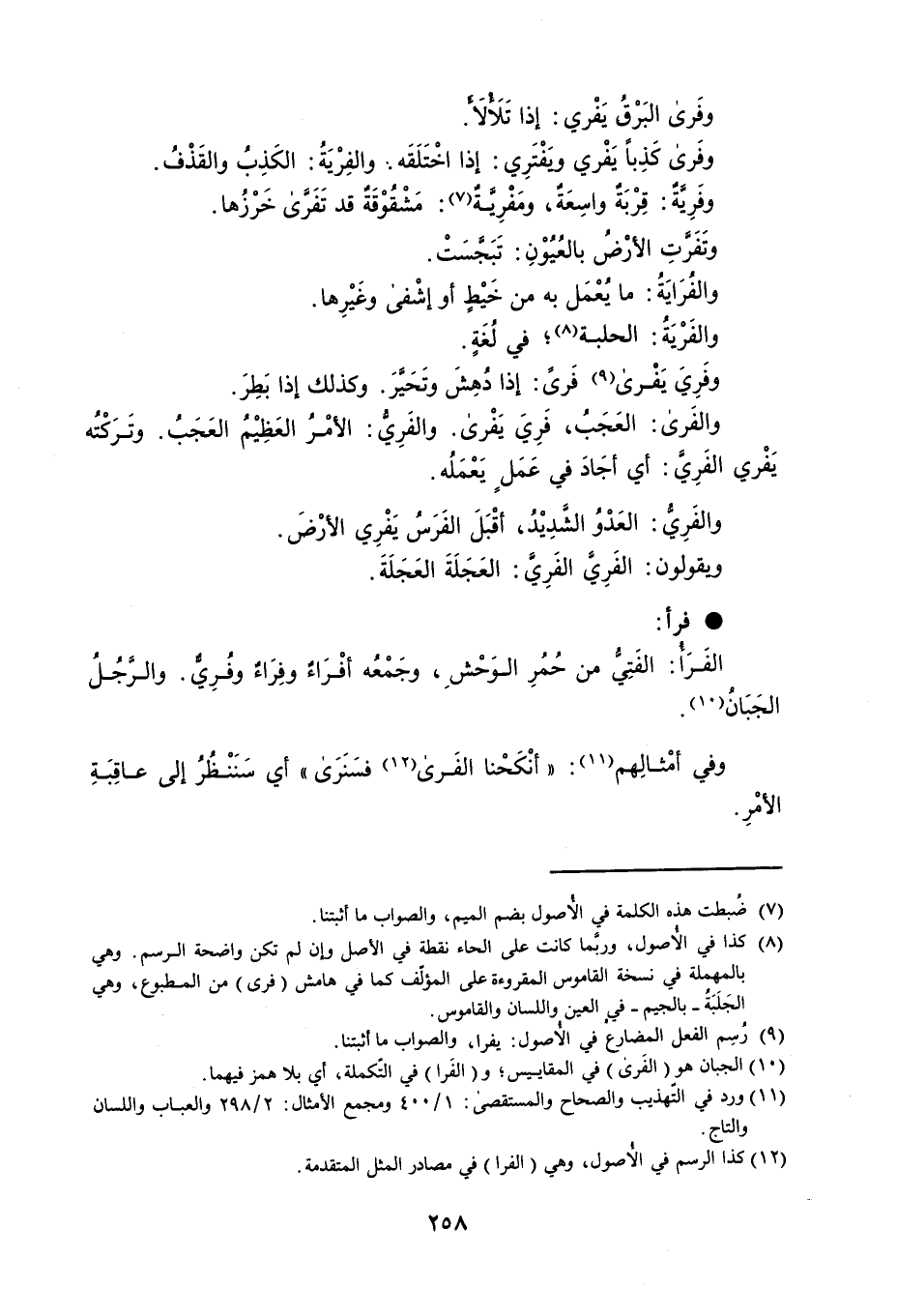 وفَرى البَرْقُ يَفْري : إذا تَلأْلأَ . وفَرى كَذِباً يَفْري ويَفْتَرِي : إذا اخْتَلَقَه . والفِرْيَةُ : الكَذِبُ والقَذْفُ . وفَرِيَّةٌ : قِرْبَةٌ واسِعَةٌ ، ومَفْرِيَّةٌ : مَشْقُوْقَةٌ فد تَفَرَّى خَرْزُها . وتَفَرَّتِ الأرْضُ بالعُيُوْنِ : تَبَجَّسَتْ . والفُرَايَةُ : ما يُعْمَل به من خَيْطٍ أو إشْفى وغَيْرِها . والفَرْيَةُ : الحلبة ؛ في لُغَةٍ . وفَرِيَ يَفْرى فَرىً : إذا دُهِشَ وتَحَيَّرَ . وكذلك إذا بَطِرَ . والفَرى : العَجَبُ ، فَرِيَ يَفْرى . والفَرِيُّ : الأمْرُ العَظِيْمُ العَجَبُ . وتَرَكْتُه يَفْري الفَرِيَّ : أي أجَادَ في عَمَلٍ يَعْمَلُه . والفَرِيُّ : العَدْوُ الشَّدِيْدُ ، أقْبَلَ الفَرَسُ يَفْرِي الأرْضَ . ويقولون : الفَرِيَّ الفَرِيَّ : العَجَلَةَ العَجَلَةَ . فرأ : الفَرَأُ : الفَتِيُّ من حُمُرِ الوَحْشِ ، وجَمْعُه أفْرَاءٌ وفِرَاءٌ وفُرِيٌّ . والرَّجُلُ الجَبَانُ . وفي أمْثالِهم : ' أنْكَحْنا الفَرى فسَنَرَى ' أي سَنَنْظُرُ إلى عاقِبَةِ الأمْرِ .