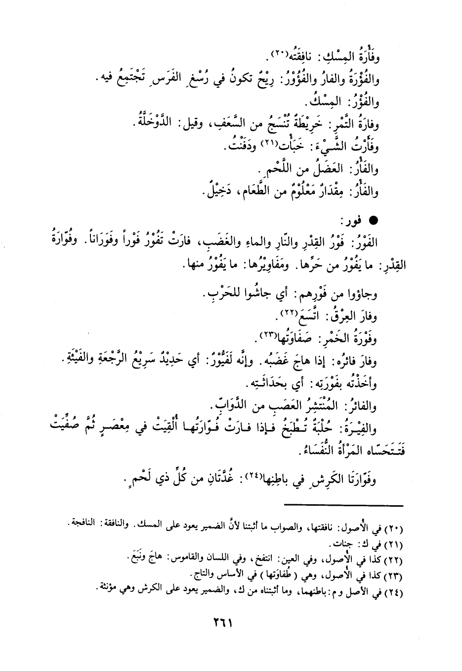 وفَأْرَةُ المِسْكِ : نافِقَتُه . والفُؤْرَةُ والفارُ والفُؤُوْرُ : رِيْحٌ تكونُ في رُسْغِ الفَرَسِ تَجْتَمِعُ فيه . والفُؤْرُ : المِسْكُ . وفارَةُ التَّمْرِ : خَرِيْطَةٌ تُنْسَجُ من السَّعَفِ ، وقيل : الدَّوْخَلَّةُ . وفَأَرْتُ الشَّيْءَ : خَبَأْت ودَفَنْتُ . والفَأْرُ : العَضَلُ من اللَّحْمِ . والفَأْرُ : مِقْدَارٌ مَعْلُوْمٌ من الطَّعَام ، دَخِيْلٌ . فور : الفَوْرُ : فَوْرُ القِدْرِ والنّارِ والماءِ والغَضَبِ ، فارَتْ تَفُوْرُ فَوْراً وفَوَرَاناً . وفُوّارَةُ القِدْرِ : ما يَفُوْرُ من حَرِّها . ومَفَاوِيْرُها : ما يَفُوْرُ منها . وجاؤوا من فَوْرِهم : أي جاشُوا للحَرْبِ . وفارَ العِرْقُ : اتَّسَعَ . وفَوْرَةُ الخَمْرِ : صَفَاوَتُها . وفارَ فائرُه : إذا هاجَ غَضَبُه . وإنَّه لَفَيُّوْرٌ : أي حَدِيْدٌ سَرِيْعُ الرَّجْعَةِ والفَيْئَةِ . وأخَذْتُه بفَوْرَتِه : أي بحَدَاثَتِه . والفائرُ : المُنْتَشِرُ العَصَبِ من الدَّوَابِّ . والفِيْرَةُ : حُلْبَةٌ تُطْبَخُ فإذا فارَتْ فَوّارَتُها أُلْقِيَتْ في مِعْصَرٍ ثُمَّ صُفِّيَتْ فَتَتَحَسّاه المَرْأةُ النُّفَسَاءُ . وفَوّارَتَا الكَرِشِ في باطِنِها : غُدَّتَانِ من كُلِّ ذي لَحْمٍ .
