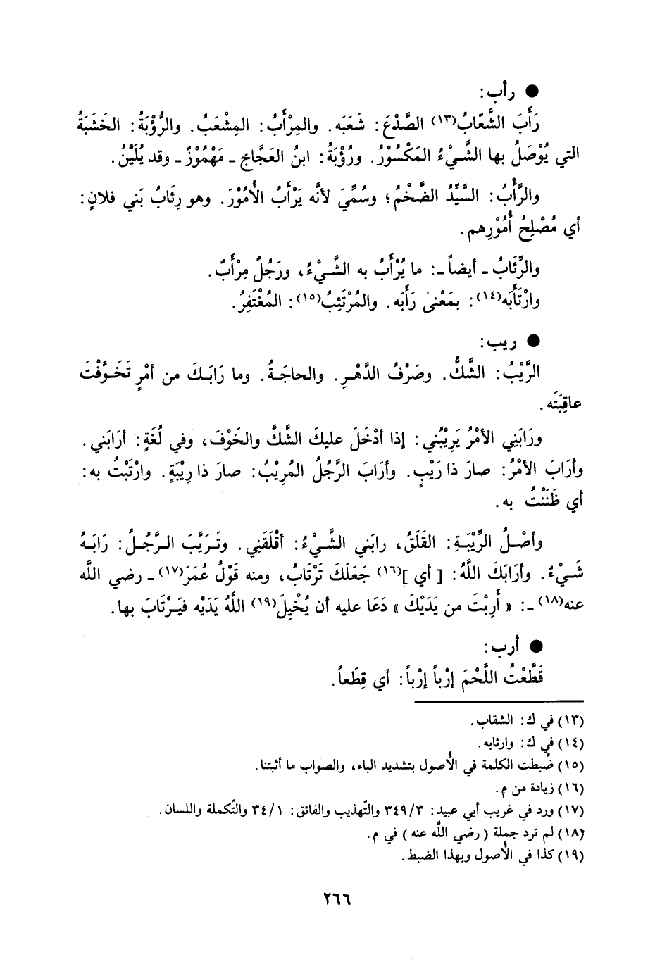 رأب : رَأَبَ الشَّعّابُ الصَّدْعَ : شَعَبَه . والمِرْأَبُ : المِشْعَبُ . والرُّؤْبَةُ : الخَشَبَةُ التي يُوْصَلُ بها الشَّيْءُ المَكْسُوْرُ . ورُؤْبَةُ : ابنُ العَجَّاج مَهْمُوْزٌ وقد يُلَيَّنُ . والرَّأْبُ : السَّيِّدُ الضَّخْمُ ؛ وسُمِّيَ لأنَّه يَرْأَبُ الأُمُوْرَ . وهو رِئَابُ بَني فلانٍ : أي مُصْلِحُ أُمُوْرِهم . والرِّئَابُ أيضاً : ما يُرْأَبُ به الشَّيْءُ ، ورَجُلٌ مِرْأَبٌ . وارْتَأَبَه : بمَعْنى رَأَبَه . والمُرْتَئِبُ : المُغْتَفِرُ . ريب : الرَّيْبُ : الشَّكُّ . وصَرْفُ الدَّهْرِ . والحاجَةُ . وما رَابَكَ من أمْرٍ تَخَوَّفْتَ عاقِبَتَه . ورَابَنِي الأمْرُ يَرِيْبُني : إذا أدْخَلَ عليكَ الشَّكَّ والخَوْفَ ، وفي لُغَةٍ : أرَابَني . وأرَابَ الأمْرُ : صارَ ذا رَيْبٍ . وأرَابَ الرَّجُلُ المُرِيْبُ : صارَ ذا رِيْبَةٍ . وارْتَبْتُ به : أي ظَنَنْتُ به . وأصْلُ الرِّيْبَةِ : القَلَقُ ، رابَني الشَّيْءُ : أقْلَقَنِي . وتَرَيَّبَ الرَّجُلُ : رَابَهُ شَيْءٌ . وأرَابَكَ اللهُ : أي جَعَلَك تَرْتَابُ ، ومنه قَوْلُ عُمَرَ رضي الله عنه : ' أَرِبْتَ من يَدَيْكَ ' دَعَا عليه أن يُخْيِلَ اللهُ يَدَيْه فيَرْتَابَ بها . أرب : قَطَّعْتُ اللَّحْمَ إرْباً إرْباً : أي قِطَعاً .