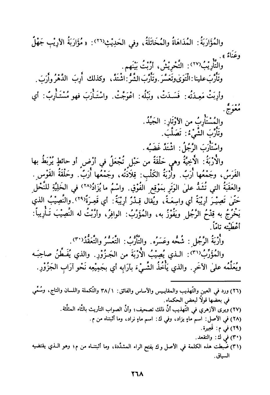 والمُؤَارَبَةُ : المُدَاهَاةُ والمُخَاتَلَةُ ، وفي الحَدِيْثِ : ' مُؤَارَبَةُ الأرِيْبِ جَهْلٌ وعَنَاءٌ ' . والتَّأْرِيْبُ : التَّحْرِيْشُ ، أرَّبْتُ بَيْنَهم . وتَأَرَّبَ علينا : الْتَوَى وتَعَسَّرَ . وتَأَرَّبَ الشَّرُّ : اشْتَدَّ ، وكذلك أَرِبَ الدَّهْرُ وأَرَبَ . وأرِبَتْ مَعِدَتُه : فَسَدَتْ ، ونَبْلُه : اعْوَجَّتْ . واسْتَأْرَبَ فهو مُسْتَأْرِبٌ : أي مُعْوَجٌّ . والمُسْتَأْرِبُ من الأوْتَارِ : الجَيِّدُ . وتَأَرَّبَ الشَّيْءُ : تَصَلَّبَ . واسْتَأْرَبَ الرَّجُلُ : اشْتَدَّ غَضَبُه . والأُرْبَةُ : الأخِيَّةُ وهي حَلْقَةٌ من حَبْلٍ تُجْعَلُ في أرْضٍ أو حائطٍ يُرْبَطُ بها الفَرَسُ ، وجَمْعُها أُرَبٌ . وأُرْبَةُ الكَلْبِ : قِلاَدَتُه ، وجَمْعُها أُرَبٌ . وحَلْقَةُ القَوْسِ . والعَقَبَةُ التي تُشَدُّ على الوَتَرِ بمَوْقِعِ الفُوْقِ . واسْمُ ما يُزَادُ في الخَلِيَّةِ للنَّحْلِ حَتّى تَصِيْرَ أرِيْبَةً أي واسِعَةً ، ويُقال قِدْرٌ أرِيْبَةٌ : أي قَعِرَةٌ . والنَّصِيْبُ الذي يَخْرُجُ به قِدْحُ الرَّجُلِ ويَفُوْزُ به ، والمُؤَرَّبُ : الوافِرُ ، وأرَّبْتُ له النَّصِيْبَ تَأْرِيباً : أعْطَيْته تامّاً . وأُرْبَةُ الرَّجُلِ : شُحُّه وعَسَرُه . والتَّأَرُّبُ : التَّعَسُّرُ والتَّعَقُّدُ . والمُؤَرِّبُ : الذي يُصِيْبُ الأُرْبَةَ من الجَزُوْرِ . والذي يُفَطِّنُ صاحِبَه ويُعَلِّمُه على الآخَرِ . والذي يَأْخُذُ الشَّيْءَ بآرَابِه أي بجَمِيْعِه نَحْو آرَابِ الجَزُوْرِ .