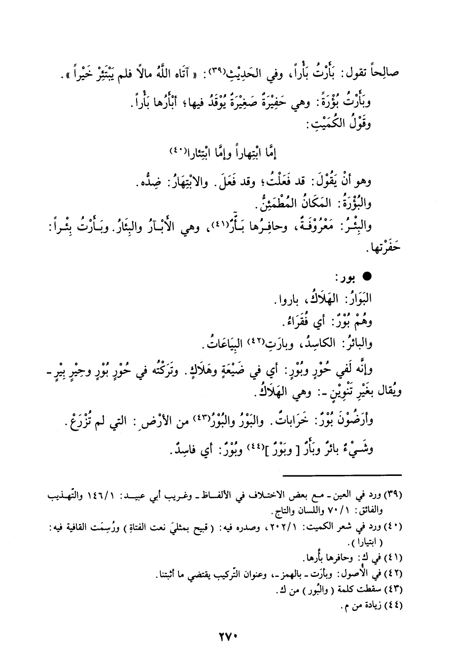 صالِحاً تقول : بَأَرْتُ بَأْراً ، وفي الحَدِيْثِ : ' آتَاه اللهُ مالاً فلم يَبْتَئِرْ خَيْراً ' . وبَأَرْتث بُؤْرَةً : وهي حَفِيْرَةٌ صَغِيْرَةٌ يُوْقَدُ فيها ؛ أبْأَرُها بَأْراً . وقَوْلُ الكُمَيْتِ : إمَّا ابْتِهاراً وإمَّا ابْتِئارا وهو أنْ يَقُوْلَ : قد فَعَلْتُ ؛ وقد فَعَلَ . والابْتِهَارُ : ضِدُّه . والبُؤْرَةُ : المَكَانُ المُطْمَئِنُّ . والبِئْرُ : مَعْرُوْفَةٌ ، وحافِرُها بَأّرٌ ، وهي الأَبْآرُ والبِئَارُ . وبَأَرْتُ بِئْراً : حَفَرْتها . بور : البَوَارُ : الهَلاَكُ ، باروا . وهُمْ بُوْرٌ : أي فُقَرَاءُ . والبائرُ : الكاسِدُ ، وبارَتِ البِيَاعَاتُ . وإنَّه لَفي حُوْرٍ وبُوْرٍ : أي في ضَيْعَةٍ وهَلاَكٍ . وتَرَكْتُه في حُوْرٍ بُوْرٍ وحِيْرٍ بِيْرٍ ويُقال بغَيْرِ تَنْوِيْنٍ : وهي الهَلاَكُ . وأرَضُوْنَ بُوْرٌ : خَرَاباتٌ . والبَوْرُ والبُوْرُ من الأرْضِ : التي لم تُزْرَعْ . وشَيْءٌ بائرٌ وبَأَرٌ وبَوْرٌ وبُوْرٌ : أي فاسِدٌ .