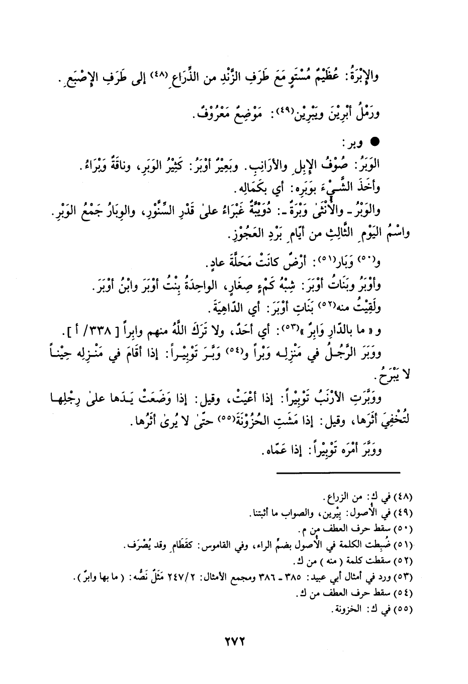 والإِبَرةُ : عظيم مستو مع طرف الزند من الذراع إلى طرف الإصبع ورمل أَبْرِيْنَ ويَبْرِيْن : موضع معروف . وبر : الوَبَرُ : صُوْفُ الإِبِلِ والأرَانِبِ . وبَعِيْرٌ أوْبَرُ : كَثِيْرُ الوَبَرِ ، وناقَةٌ وَبْرَاءُ . وأخَذَ الشَّيْءَ بوَبَرِه : أي بكَمَالِه . والوَبْرُ والأُنْثَى وَبْرَةٌ : دُوَيْبَّةٌ غَبْرَاءُ على قَدْرِ السِّنَّوْرِ ، والوِبَارُ جَمْعُ الوَبْرِ . واسْمُ اليَوْمِ الثَّالِثِ من أيّامِ بَرْدِ العَجُوْزِ . ووَبَار : أرْضٌ كانَتْ مَحَلَّةَ عادٍ . وأوْبَرُ وبَنَاتُ أوْبَرَ : شِبْهُ كَمْءٍ صِغَارٍ ، الواحِدَةُ بِنْتُ أوْبَرَ وابْنُ أوْبَرَ . ولَقِيْتُ منه بَنَاتِ أوْبَرَ : أي الدّاهِيَةَ . و ' ما بالدّارِ وَابِرٌ ' : أي أحَدٌ ، ولا تَرَكَ اللهُ منهم وابِراً . ووَبَرَ الرَّجُلُ في مَنْزِلِه وَبْراً ووَبَّرَ تَوْبِيْراً : إذا أقَامَ في مَنْزِلِه حِيْناً لا يَبْرَحُ . ووَبَّرَتِ الأرْنَبُ تَوْبِيْراً : إذا أعْيَتْ ، وقيل : إذا وَضَعضتْ يَدَها على رِجْلِها لتُخْفِيَ أثَرَها ، وقيل : إذا مَشَتِ الحُزُوْنَةَ حتّى لا يُرى أثَرُها . ووَبَّرَ أمْرَه تَوْبِيْراً : إذا عَمّاه .