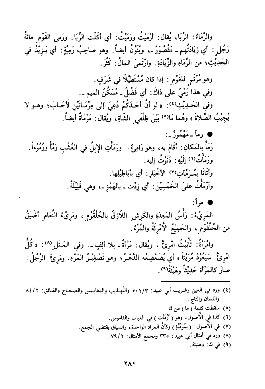 والرَّمَاءُ : الرِّبَا ، يُقال : أرْمَيْتُ ورَمَيْتُ : أي أكَلْت الرِّبَا . ورَمى القَوْمِ مائةُ رَجُلٍ : أي زِيَادَتُهم مَقْصُوْرٌ ، ويُنَوَّنُ أيضاً . وهو صاحِبُ رَمِيَّةٍ : اي يَزِيْدُ في الحَدِيْثِ ؛ من الرَّمَاءِ والزِّيَادَةِ . وارْتَمى المالُ : كَثُرَ . وهو مُرْتَمٍ للقَوْمِ : إذا كان مُسْتَطِيْلاً في شَرَفٍ . وفي هذا رَمْيٌ على ذاكَ : أي فَضْلٌ مُسَكَّنُ الميم . وفي الحَدِيْثِ : ' لو أنَّ أحَدَكُمْ دُعِيَ إلى مِرْمَاتَيْنِ لأَجَابَ ؛ وهو لا يُجِيْبُ الصَّلاةَ ' وهُما مَا بَيْنَ ظِلْفَيِ الشّاةِ ، ويُقال : مَرْمَاةٌ أيضاً . رمأ مَهْمُوزٌ : رَمَأَ بالمَكانِ : أقَامَ به ، وهو رَامِىءٌ . ورَمَأَتِ الإِبِلُ في العُشْبِ رَمْأً ورُمُوْءاً . ورَمَأْتُ إلَيْهِ : دَنَوْتُ إليه . وأتَانَا بمُرَمَّآتِ الأخْبَارِ : أي بأبَاطِيْلِها . وأرْمَأْتُ على الخَمْسِيْنَ : أي زِدْت بالهَمْزِ ، وهي قَلِيْلَةٌ . مرأ : المَرِيْءُ : رَأْسُ المَعِدَةِ والكَرِشِ اللاّزِقُ بالحُلْقُوْمِ ، ومَرِيْءُ النَّعَامِ أضْيَقُ من الحُلْقُوْمِ ، والجَمِيْعُ الأَمْرِئَةُ والمُرُءُ . وامْرَأَةٌ : تَأْنِيْثُ امْرِىءٍ ، ويُقال : مَرْأةٌ بلا ألِفٍ . وفي المَثَلِ : ' كُلُّ امْرِيءٍ سَيَعُوْدُ مُرَيْئاً ' أي يُضَعْضِعُه الدَّهْرُ ؛ وهو تَصْغِيْرُ المَرْءِ . ومَرِىءَ الرَّجُلُ : صارَ كالمَرْأة حَدِيْثاً وهَيْئَةً .