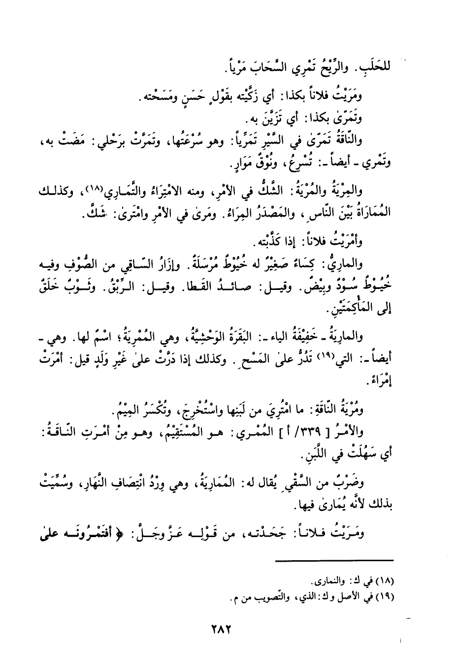 للحَلَبِ . والرِّيْحُ تَمْرِي السَّحَابَ مَرْياً . ومَرَيْتُ فلاناً بكذا : أي زَكَّيْته بقَوْلٍ حَسَنٍ ومَسَحْته . وتَمَرّى بكذا : أي تَزَيَّنَ به . والنّاقَةُ تَمَرّى في السَّيْرِ تَمَرِّياً : وهو سُرْعَتُها ، وتَمَرَّتْ برَحْلي : مَضَتْ به ، وتَمْري أيضاً : تُسْرعُ ، ونُوْقٌ مَوَارٍ . والمِرْيَةُ والمُرْيَةُ : الشَّكُّ في الأمْرِ ، ومنه الامْتِرَاءُ والتَّمَارِي ، وكذلك المُمَارَاةُ بَيْنَ النّاسِ ، والمَصْدَرُ المِرَاءُ . ومَرى في الأمْرِ وامْتَرى : شَكَّ . وأمْرَيْتُ فلاناً : إذا كَذَّبْته . والمارِيُّ : كِسَاءٌ صَغِيْرٌ له خُيُوْطٌ مُرْسَلَةٌ . وإزَارُ السّاقِي من الصُّوْفِ وفيه خُيُوْطٌ سُوْدٌ وبِيْضٌ . وقيل : صائدُ القَطا . وقيل : الرِّبْقُ . وثَوْبٌ خَلَقٌ إلى المَأْكِمَتَيْنِ . والمارِيَةُ خَفشيْفَةُ الياء : البَقَرَةُ الوَحْشِيَّةُ ، وهي المُمْرِيَةُ ؛ اسْمٌ لها . وهي أيضاً : التي تَدُرُّ على المَسْحِ . وكذلك إذا دَرَّتْ على غَيْرِ وَلَدٍ قيل : أمْرَتْ إمْرَأءً . ومُرْيَةُ النّاقَةِ : ما امْتُرِيَ من لَبَنِها واسْتُخْرِجَ ، وتُكْسَرُ المِيْمُ . والأمْرُ المُمْري : هو المُسْتَقِيْمُ ، وهو مِنْ أمْرَتِ النّاقَةُ : أي سَهُلَتْ في اللَّبَنِ . وضَرْبٌ من السَّقْيِ يُقال له : المُمَارِيَةُ ، وهي وِرْدُ انْتِصَافِ النَّهَارِ ، وسُمِّيَتْ بذلك لأنَّه يُمَارى فيها . ومَرَيْتُ فلاناً : جَحَدْته ، من قَوْلِه عَزَّ وجَلَّ : ' أفتَمْرُونَه على