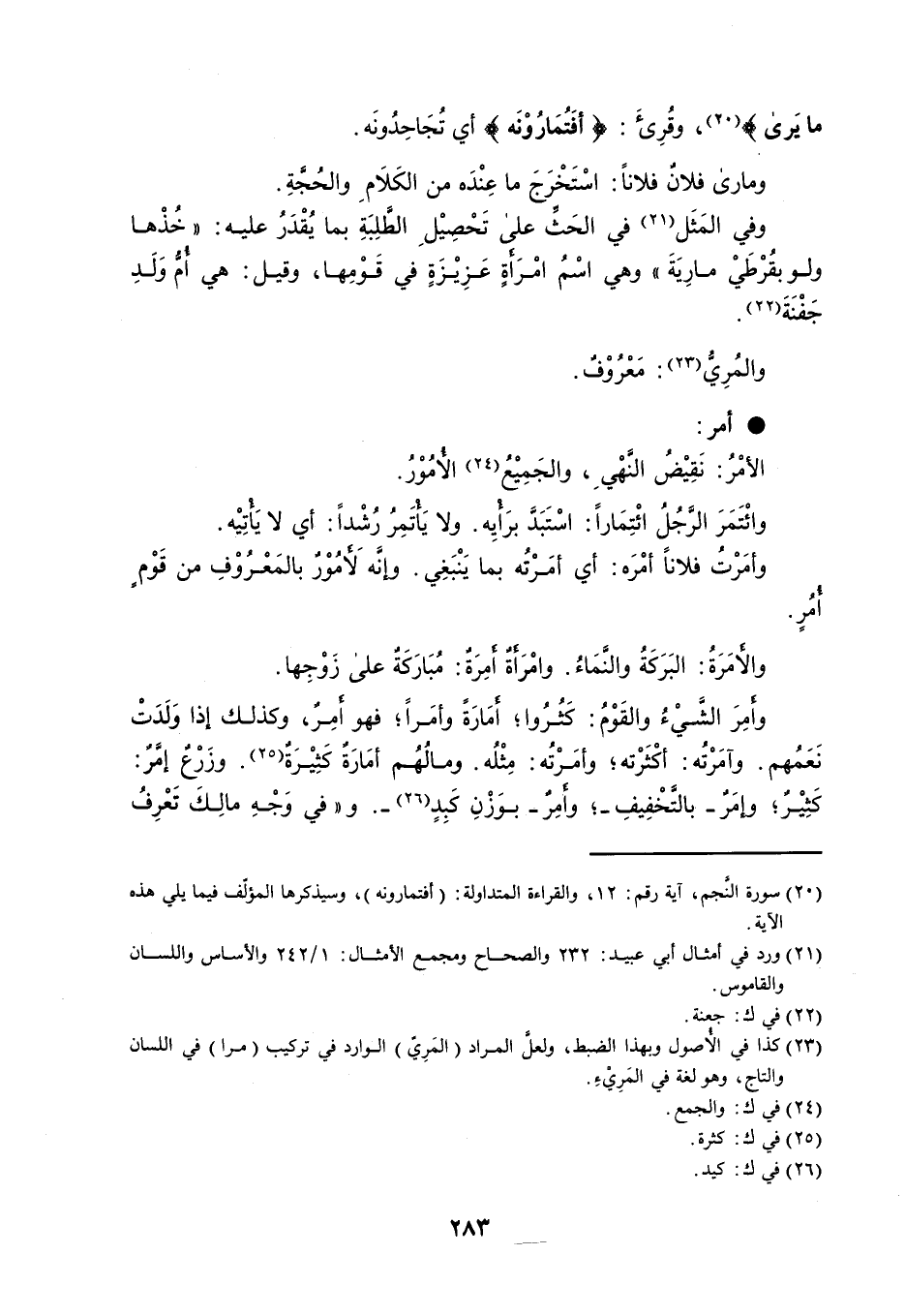 ما يَرى ' ، وقُرِىءَ : ' أفَتُمَارُوْنَه ' أي تُجَاحِدُونَه . ومارى فلانٌ فلاناً : اسْتَخْرَجَ ما عِنْدَه من الكَلاَمِ والحُجَّةِ . وفي المَثَل في الحَثِّ على تَحْصِيْلِ الطَّلِبَةِ بما يُقْدَرُ عليه : ' خُذْها ولو بقُرْطَيْ مارِيَةَ ' وهي اسْمُ امْرَأَةٍ عَزِيْزَةٍ في قَوْمِها ، وقيل : هي أُمُّ وَلَدِ جَفْنَةَ . والمُرِيُّ : مَعْرُوْفٌ . أمر : الأمْرُ : نَقِيْضُ النَّهْيِ ، والجَمِيْعُ الأُمُوْرُ . وائْتَمَرَ الرَّجُلُ ائْتِمَاراً : اسْتَبَدَّ برَأْيِه . ولا يَأْتَمِرُ رُشْداً : أي لا يَأْتِيْه . وأمَرْتُ فلاناً أمْرَه : أي أمَرْتُه بما يَنْبَغِي . وإنَّه لأَمُوْرٌ بالمَعْرُوْفِ من قَوْمٍ أُمُرٍ . والأَمَرَةُ : البَرَكَةُ والنَّمَاءُ . وامْرَأَةٌ أَمِرَةٌ : مُبَارَكَةٌ على زَوْجِها . وأَمِرَ الشَّيْءُ والقَوْمُ : كَثُرُوا ؛ أَمَارَةً وأمَراً ؛ فهو أَمِرٌ ، وكذلك إذا وَلَدَتْ نَعَمَهُم . وآمَرْتُه : أكْثَرْته ؛ وأمَرْتُه : مِثْلُه . ومالُهُم أمَارَةٌ كَثِيْرَةٌ . وزَرْعٌ إمَّرٌ : كَثِيْرٌ ؛ وإمَرٌ بالتَّخْفِيفِ ؛ وأَمِرٌ بوَزْنِ كَبِدٍ . و ' في وَجْهِ مالِكَ تَعْرِفُ