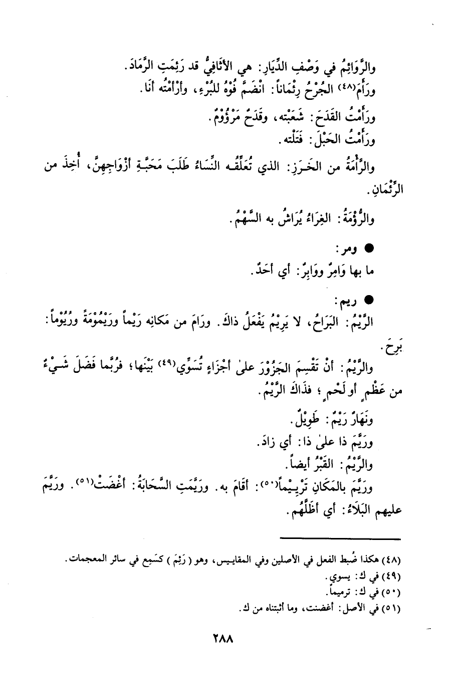 والرَّوَائِمُ في وَصْفِ الدِّيَارِ : هي الأثَافِيُّ قد رَئِمَتِ الرَّمَادَ . ورَأَمَ الجُرْحُ رِئْمَاناً : انْضَمَّ فُوْهُ للبُرْءِ ، وأرْأمْتُه أنَا . ورَأَمْتُ القَدَحَ : شَعَبْته ، وقَدَحٌ مَرْؤُوْمٌ . ورَأَمْتُ الحَبْلَ : فَتَلْته . والرَّأْمَةُ من الخَرَزِ : الذي تُعَلِّقُه النِّسَاءُ طَلَبَ مَحَبَّةِ أزْوَاجِهِنَّ ، أُخِذَ من الرِّئْمَانِ . والرُّؤْمَةُ : الغِرَاءُ يُرَاشُ به السَّهْمُ . ومر : ما بها وَاتمِرٌ ووَابِرٌ : أي أحَدٌ . ريم : الرَّيْمُ : البَرَاحُ ، لا يَرِيْمُ يَفْعَلُ ذاكَ . ورَامَ من مَكانِه رَيْماً ورَيْمُوْمَةً ورُيُوْماً : بَرِحَ . والرَّيْمُ : أنْ تَقْسِمَ الجَزُوْرَ على أجْزَاءٍ تُسَوِّي بَيْنَها ؛ فرُبَّما فَضَلَ شَيْءٌ من عَظْمٍ أو لَحْمٍ ؛ فذَاكَ الرَّيْمُ . ونَهَارٌ رَيْمٌ : طَوِيْلٌ . ورَيَّمَ ذا على ذا : أي زادَ . والرَّيْمُ : القَبْرُ أيضاً . ورَيَّمَ بالمَكَانِ تَرْيِيْماً : أقَامَ به . ورَيَّمَتِ السَّحَابَةُ : أغْضَتْ . ورَيَّمَ عليهم البَلاَءُ : أي أظَلَّهُمْ .