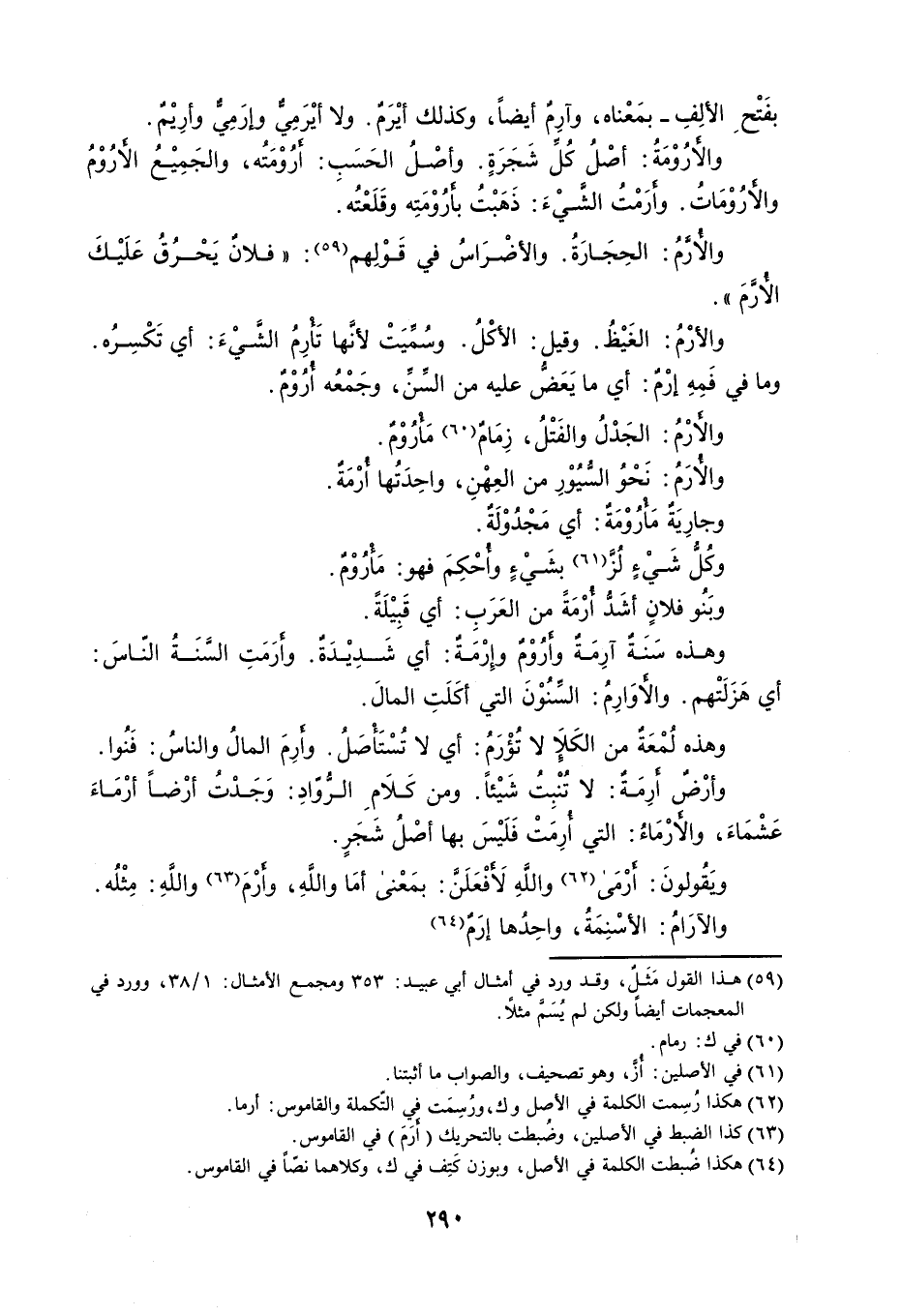 بفَتْحِ الألِفِ بمَعْناه ، وآرِمٌ أيضاً ، وكذلك أيْرَمٌ . ولا أيْرَمِيٌّ وإرَمِيٌّ وأرِيْمٌ . والأَرُوْمَةُ : أصْلُ كُلِّ شَجَرَةٍ . وأصْلُ الحَسَبِ : أَرُوْمَتُه ، والجَمِيْعُ الأَرُوْمُ والأَرُوْمَاتُ . وأَرَمْتُ الشَّيْءَ : ذَهَبْتُ بأَرُومَتِه وقَلَعْتُه . والأُرَّمُ : الحِجَارَةُ . والأضْرَاسُ في قَوْلِهم : ' فلانٌ يَحْرُقُ عَلَيْكَ الأُرَّمَ ' . والأرْمُ : الغَيْظُ . وقيل : الأكْلُ . وسُمِّيَتْ لأنَّها تَأْرِمُ الشَّيْءَ : أي تَكْسِرُه . وما في فَمِهِ إرْمٌ : أي ما يَعَضُّ عليه من السِّنِّ ، وجَمْعُه أُرُوْمٌ . والأَرْمُ : الجَدْلُ والفَتْلُ ، زِمَامٌ مَأْرُوْمٌ . والأُرَمُ : نَحْوُ السُّيُوْرِ من العِهْنِ ، واحِدَتُها أُرْمَةٌ . وجارِيَةٌ مَأْرُوْمَةٌ : أي مَجْدُوْلَةٌ . وكُلُّ شَيْءٍ لُزَّ بشَيْءٍ وأُحْكِمَ فهو : مَأْرُوْمٌ . وبَنُو فلانٍ أشَدُّ أُرْمَةً من العَرَبِِ : أي قَبِيْلَةً . وهذه سَنَةٌ آرِمَةٌ وأَرُوْمٌ وإرْمَةٌ : أي شَدِيْدَةٌ . وأَرَمَتِ السَّنَةُ النّاسَ : أي هَزَلَتْهم . والأَوَارِمُ : السِّنُوْنَ التي أكَلَتِ المالَ . وهذه لُمْعَةٌ من الكَلإِ لا تُؤْرَمُ : أي لا تُسْتَأْصَلُ . وأَرِمَ المالُ والناسُ : فَنُوا . وأرْضٌ أَرِمَةٌ : لا تُنْبِتُ شَيْئاً . ومن كَلاَمِ الرُّوّادِ : وَجَدْتُ أرْضاً أرْمَاءَ عَشْمَاءَ ، والأَرْمَاءُ : التي أُرِمَتْ فَلَيْسَ بها أصْلُ شَجَرٍ . ويَقُولونَ : أَرْمَى واللهِ لأَفْعَلَنَّ : بمَعْنى أمَا واللهِ ، وأَرْمَ واللهِ : مِثْلُه . والآرَامُ : الأسْنِمَةُ ، واحِدُها إرَمٌ .