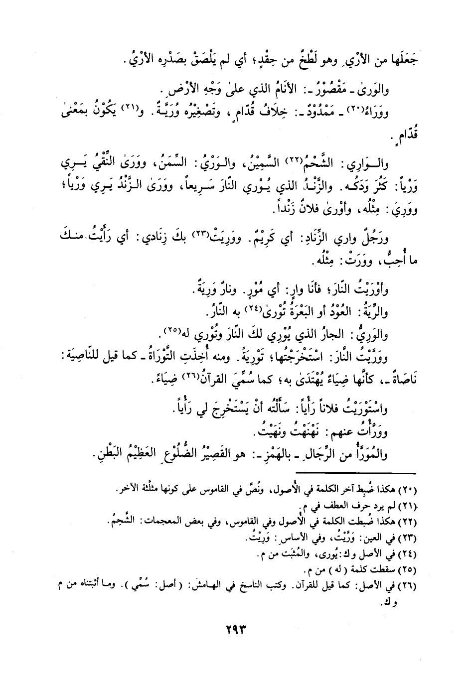 جَعَلَها من الأرْيِ وهو لَطْخٌ من حِقْدٍ ؛ أي لم يَلْصَقْ بصَدْرِه الأرْيُ . والوَرى مَقْصُوْرٌ : الأنَامُ الذي على وَجْهِ الأرْضِ . ووَرَاءُ مَمْدُوْدٌ : خِلاَفُ قُدّامٍ ، وتَصْغِيْرُه وُرَيَّةٌ . ويَكُوْنُ بمَعْنى قُدّامٍ . والوَارِي : الشَّحْمُ السَّمِيْنُ ، والوَرْيُ : السِّمَنُ ، ووَرَى النِّقْيُ يَرِي وَرْياً : كَثُرَ وَدَكُه . والزَّنْدُ الذي يُوْري النّارَ سَرِيعاً ، ووَرَى الزَّنْدُ يَرِي وَرْياً ؛ ووَرِيَ : مِثْلُه ، وأوْرى فلانٌ زَنْداً . ورَجُلٌ واري الزِّنَادِ : أي كَرِيْمٌ . ووَرِيَتْ بكَ زِنَادي : أي رَأَيْتُ منكَ ما أُحِبُّ ، ووَرَتْ : مِثْلُه . وأوْرَيْتُ النّارَ ؛ فأنَا وارٍ : أي مُوْرٍ . ونارٌ وَرِيَةٌ . والرِّيَةُ : العُوْدُ أو البَعْرَةُ تُوْرى به النّارُ . والوَرِيُّ : الجارُ الذي يُوْرِي لكَ النّارَ وتُوْري له . ووَرَّيْتُ النَّارَ : اسْتَخْرَجْتُها ؛ تَوْرِيَةً . ومنه أُخِذَتِ التَّوْرَاةُ كما قيل للنّاصِيَة : نَاصَاةٌ ، كأنَّها ضِيَاءٌ يُهْتَدَى به ؛ كما سُمِّيَ القرآنُ ضِيَاءً . واسْتَوْرَيْتُ فلاناً رَأْياً : سَأَلْتُه أنْ يسْتَخْرِجَ لي رَأْياً . ووَرَّأْتُ عنهم : نَهْنَهْتُ ونَهَيْتُ . والمُوَرَّأُ من الرِّجَالِ بالهَمْزِ : هو القَصِيْرُ الضُّلُوْعِ العَظِيْمُ البَطْنِ .