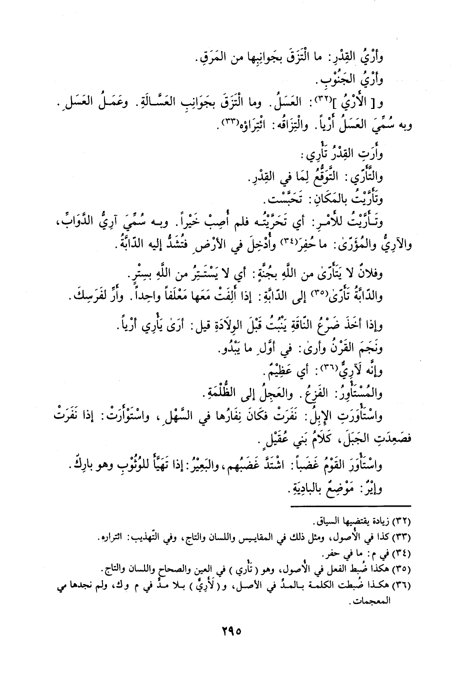 وأرْيُ القِدْرِ : ما الْتَزَقَ بجَوانِبِها من المَرَقِ . وأرْيُ الجَنُوْبِ . والأَرْيُ : العَسَلُ . وما الْتَزَقَ بجَوَانِبِ العَسَّالَةِ . وعَمَلُ العَسَلِ . وبه سُمِّيَ العَسَلُ أَرْياً . والْتِزَاقُه : ائْتِرَاؤه . وأَرَتِ القِدْرُ تَأْرِي : والتَّأَرّي : التَّوَقُّعُ لِمَا في القِدْرِ . وتَأَرَّيْتُ بالمَكَانِ : تَحَبَّسْت . وتَأَرَّيْتُ للأَمْرِ : أي تَحَرَّيْتُه فلم أُصِبْ خَيْراً . وبه سُمِّيَ آرِيُّ الدَّوَابِّ ، والآرِيُّ والمُؤَرّى : ما حُفِرَ وأُدْخِلَ في الأرْضِ فتُشَدُّ إليه الدّابَّةُ . وفلانٌ لا يَتَأَرّى من اللهِ بجُنَّةٍ : أي لا يَسْتَتِرُ من اللهِ بسِتْرٍ . والدّابَّةُ تَأَرّى إلى الدّابَّةِ : إذا أَلِفَتْ مَعَها مَعْلَفاً واحِداً . وأرِّ لفَرَسِكَ . وإذا أخَذَ ضَرْعُ النّاقَةِ يَنْبُتُ قَبْلَ الوِلاَدَةِ قيل : أرَى يَأْرِي أرْياً . ونَجَمَ القَرْنُ وأرى : في أوَّلِ ما يَبْدُو . وإنَّه لآرِيٌّ : أي عَظِيْمٌ . والمُسْتَأْوِرُ : الفَزِعُ . والعَجِلُ إلى الظُّلْمَةِ . واسْتَأْوَرَتِ الإِبِلُ : نَفَرَتْ فكَانَ نِفَارُها في السَّهْلِ ، واسْتَوْأَرَتْ : إذا نَفَرَتْ فصَعِدَتِ الجَبَلَ ، كَلاَمُ بَني عُقَيْلٍ . واسْتَأْوَرَ القَوْمُ غَضَباً : اشْتَدَّ غَضَبُهم ، والبَعِيْرُ : إذا تَهَيَّأَ للوُثُوْبِ وهو بارِكٌ . وإيْرٌ : مَوْضِعٌ بالبادِيَةِ .