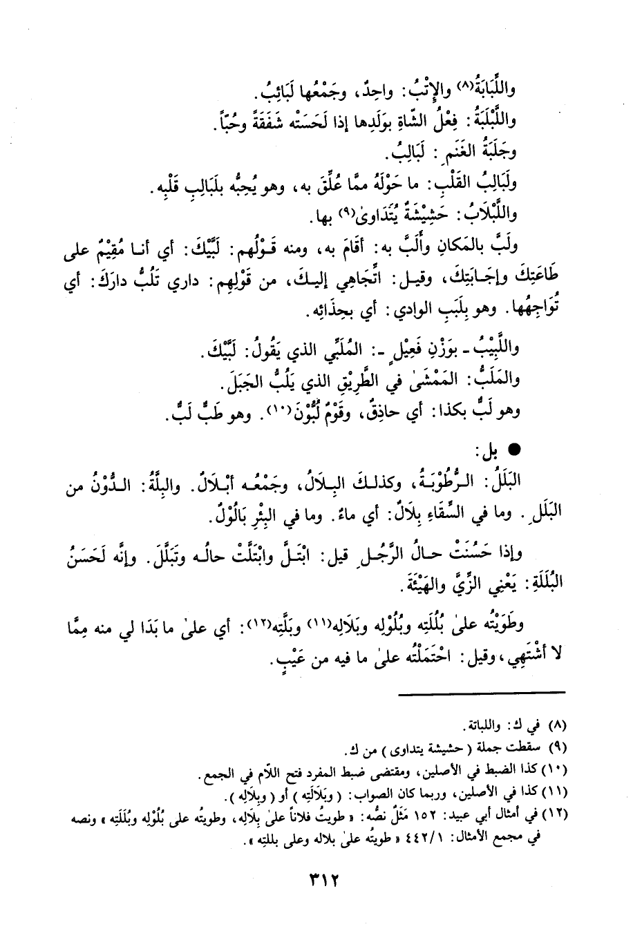واللِّبَابَةُ والإِتْبُ : واحِدٌ ، وجَمْعُها لَبَائِبُ . واللَّبْلَبَةُ : فِعْلُ الشّاةِ بوَلَدِها إذا لَحَسَتْه شَفَقَةً وحُبّاً . وجَلَبَةُ الغَنَمِ : لَبَالِبُ . ولَبَالِبُ القَلْبِ : ما حَوْلَه ممَّا عُلِّقَ به ، وهو يُحِبُّه بلَبَالِبِ قَلْبِه . واللَّبْلاَبُ : حَشِيْشَةٌ يُتَدَاوى بها . ولَبَّ بالمَكانِ وأَلَبَّ به : أقَامَ به ، ومنه قَوْلُهم : لَبَّيْكَ : أي أنا مُقِيْمٌ على طَاعَتِكَ وإجَابَتِكَ ، وقيل : اتِّجَاهِي إليكَ ، من قَوْلِهِم : داري تَلُبُّ دارَكَ : أي تُوَاجِهُها . وهو بِلَبَبِ الوادي : أي بحِذَائِه . واللَّبِيْبُ بوَزْنِ فَعِيْلٍ : المُلَبِّي الذي يَقُولُ : لَبَّيْكَ . والمَلَبُّ : المَمْشَى في الطَّرِيْقِ الذي يَلُبُّ الجَبَلَ . وهو لَبٌّ بكذا : أي حاذِقٌ ، وقَوْمٌ لُبُّوْنَ . وهو طَبٌّ لَبٌّ . بل : البَلَلُ : الرُّطُوْبَةُ ، وكذلكَ البِلاَلُ ، وجَمْعُه أبْلاَلٌ . والبِلَّةُ : الدُّوْنُ من البَلَلِ . وما في السِّقَاءِ بِلاَلٌ : أي ماءٌ . وما في البِئْرِ بَالُوْلٌ . وإذا حَسُنَتْ حالُ الرَّجُلِ قيل : ابْتَلَّ وابْتَلَّتْ حالُه وتَبَلَّلَ . وإنَّه لَحَسَنُ البُلَلَةِ : يَعْنِي الزِّيَّ والهَيْئَةَ . وطَوَيْتُه على بُلُلَتِه وبُلُوْلِه وبَلاَلِه وبَلَّتِه : أي على ما بَدَا لي منه مِمَّا لا أشْتَهِي ، وقيل : احْتَمَلْتُه على ما فيه من عَيْبٍ .