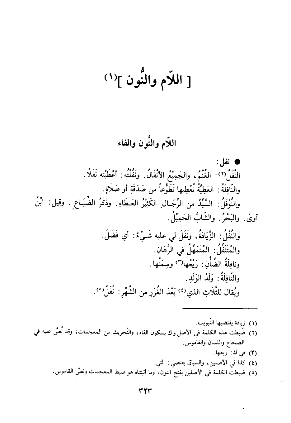 نفل : النَّفَلُ : الغُنْمُ ، والجَمِيْعُ الأنْفَالُ . ونَفَّلْتُه : أعْطَيْته نَفَلاً . والنّافِلَةُ : العَطِيَّةُ تُعْطِيها تَطَوُّعاً من صَدَقَةٍ أو صَلاَةٍ . والنَّوْفَلُ : السَّيِّدُ من الرِّجَالِ الكَثِيْرُ العَطَاءِ . وذَكَرُ الضِّبَاعِ . وقيل : ابْنُ آوى . والبَحْرُ . والشّابُّ الجَمِيْلُ . والنَّفْلُ : الزِّيَادَةُ ، ونَفَلَ لي عليه شَيْءٌ : أي فَضَلَ . والمُتَنَفِّلُ : المُتَمَهِّلُ في الرِّهَانِ . ونافِلَةُ الضَّأْنِ : رَيْعُها وسِمَنُها . والنّافِلَةُ : وَلَدُ الوَلَدِ . ويُقال للثَّلاَثِ الذي بَعْدَ الغُرَرِ من الشَّهْرِ : نُفَلٌ .