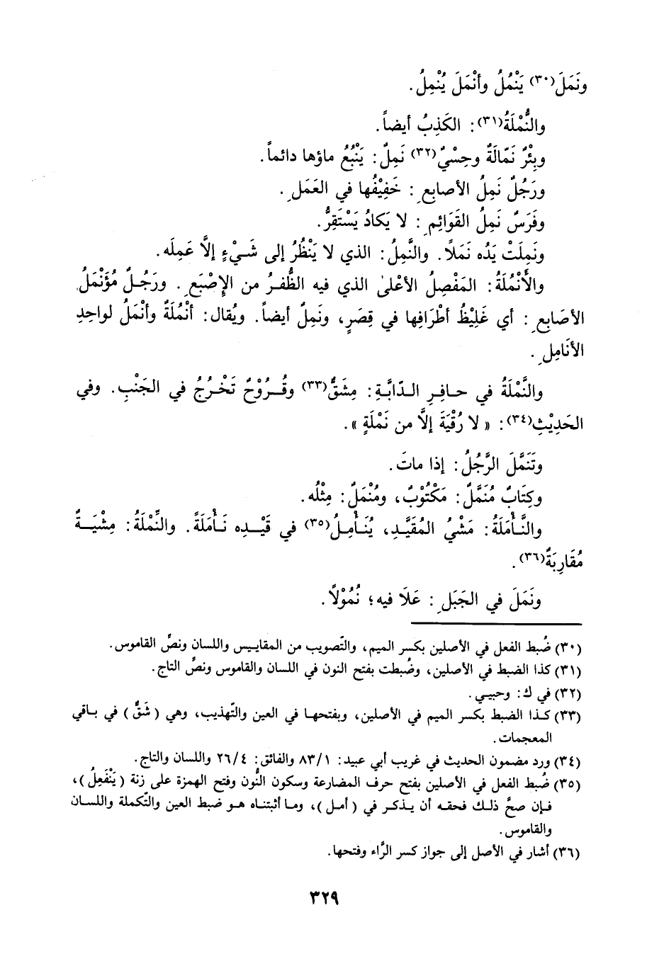 ونَمَلَ يَنْمُلُ وأنْمَلَ يُنْمِلُ . والنُّمْلَةُ : الكَذِبُ أيضاً . وبِئْرٌ ثَمّالَةٌ وحِسْيٌ نَمِلٌ : يَنْبُعُ ماؤها دائماً . ورَجُلٌ نَمِلُ الأصابعِ : خَفِيْفُها في العَمَلِ . وفَرَسٌ نَمِلُ القَوَائِمِ : لا يَكادُ يَسْتَقِرُّ . ونَمِلَتْ يَدُه نَمَلاً . والنَّمِلُ : الذي لا يَنْظُرُ إلى شَيْءٍ إلاَّ عَمِلَه . والأَنْمُلَةُ : المَفْصِلُ الأعْلى الذي فيه الظُّفرُ من الإِصْبَعِ . ورَجُلٌ مُؤَنْمَلُ الأصَابِعِ : أي غَلِيْظُ أطْرَافِها في قِصَرٍ ، ونَمِلٌ أيضاً . ويُقال : أنْمُلَةٌ وأنْمَلُ لواحِدِ الأنَامِلِ . والنَّمْلَةُ في حافِرِ الدّابَّةِ : مِشَقٌّ وقُرُوْحٌ تَخْرُجُ في الجَنْبِ . وفي الحَدِيْثِ : ' لا رُقْيَةَ إلاَّ من نَمْلَةٍ ' . وتَنَمَّلَ الرَّجُلُ : إذا ماتَ . وكِتَابٌ مُنَمَّلٌ : مَكْتُوْبٌ ، ومُنْمَلٌ : مِثْلُه . والنَّأْمَلَةُ : مَشْيُ المُقَيَّدِ ، يُنَأْمِلُ في قَيْدِه نَأْمَلَةً . والنِّمْلَةُ : مِشْيَةٌ مُقَارِبَةٌ . ونَمَلَ في الجَبَلِ : عَلاَ فيه ؛ نُمُوْلاً .
