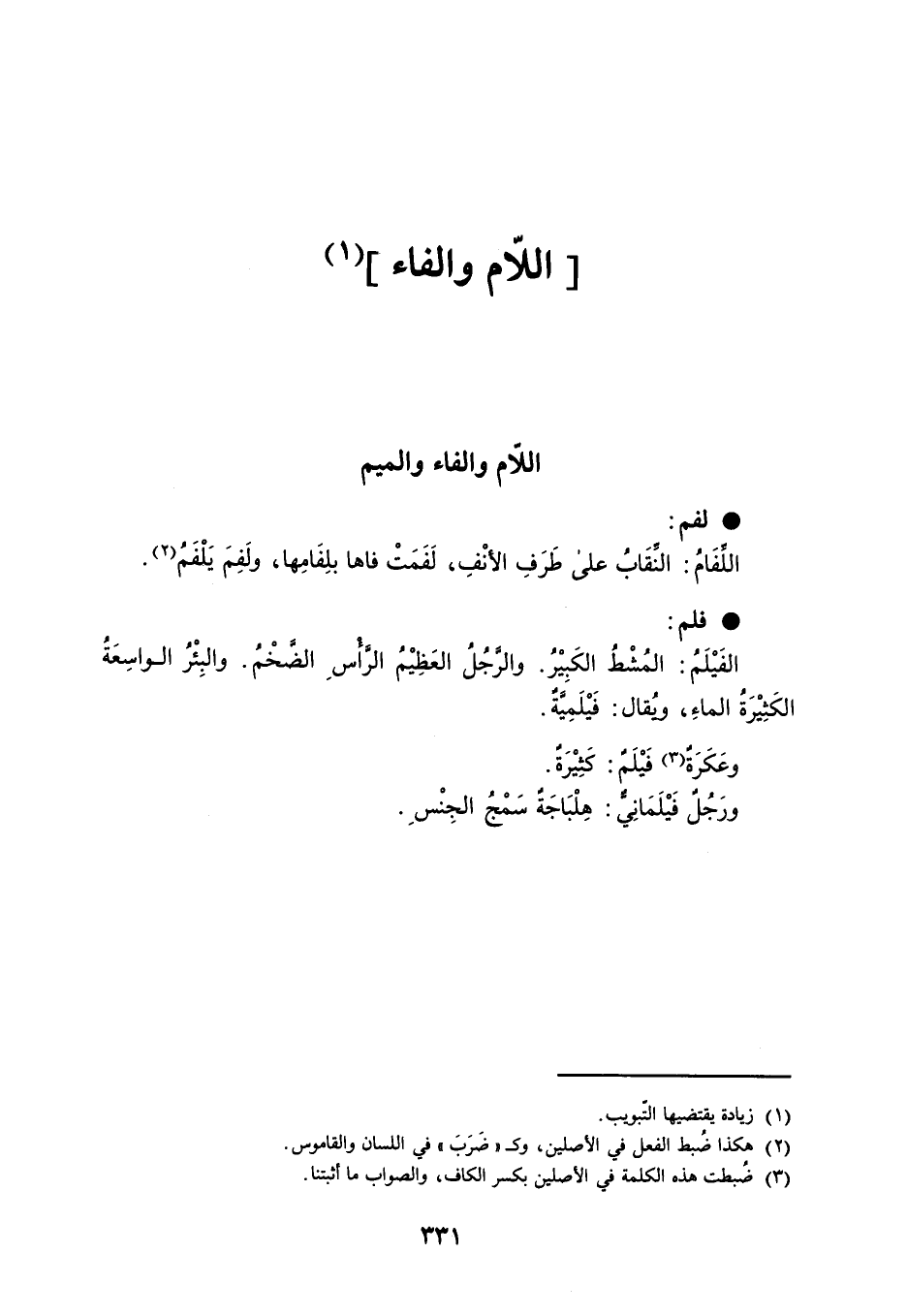 لفم : اللِّفَامُ : النِّقَابُ على طَرَفِ الأنْفِ ، لَفَمَتْ فاها بلِفَامِها ، ولَفِمَ يَلْفَمُ . فلم : الفِيْلَمُ : المُشْطُ الكَبِيْرُ . والرَّجُلُ العَظِيْمُ الرَّأْسِ الضَّخْمُ . والبِئْرُ الواسِعَةُ الكَثِيْرَةُ الماءِ ، ويُقال : فَيْلَمِيَّةٌ . وعَكَرَةٌ فَيْلَمٌ : كَثِيْرَةٌ . ورَجُلٌ فَيْلَمَانِيٌّ : هِلْبَاجَةٌ سَمْجُ الجِنْسِ .