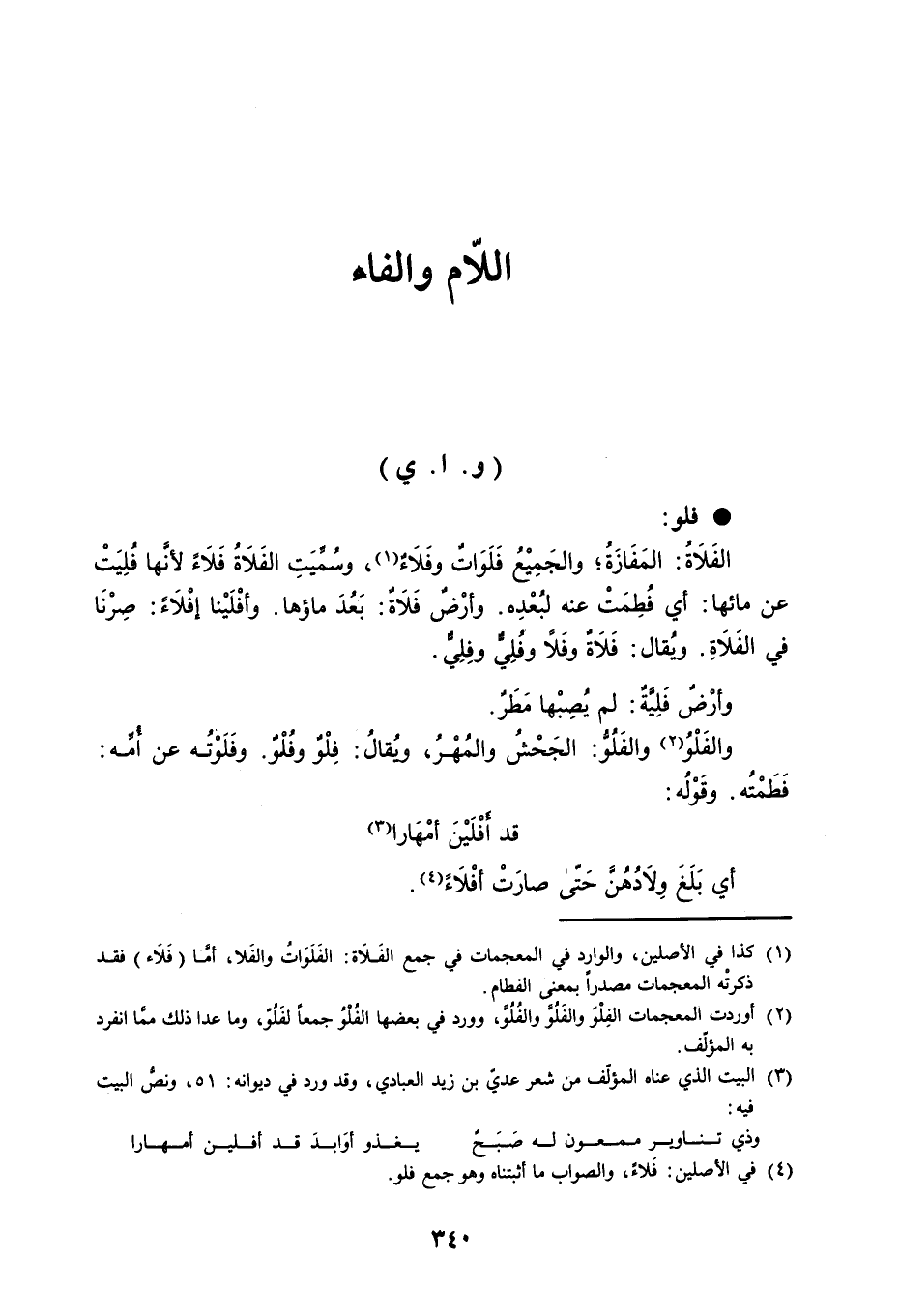 فلو : الفَلاَةُ : المَفَازَةُ ، والجَمِيْعُ فَلَوَاتٌ وفَلاَءٌ ، وسُمِّيَتِ الفَلاَةُ فَلاَءً لأنَّها فُلِيَتْ عن مائها : أي فُطِمَتْ عنه لبُعْدِه . وأرْضٌ فَلاَةٌ : بَعُدَ ماؤها . وأفْلَيْنا إفْلاَءً : صِرْنَا في الفَلاَةِ . ويُقال : فَلاَةٌ وفَلاً وفُلِيٌّ وفِلِيٌّ . وأرْضٌ فَلِيَّةُ : لم يُصِبْها مَطَرٌ . والفَلْوُ والفَلُوُّ : الجَحْشُ والمُهْرُ ، ويُقالُ : فِلْوٌ وفُلْوٌ . وفَلَوْتُه عن أُمِّه : فَطَمْتُه . وقَوْلُه : قد أَفْلَيْنَ أمْهَارا أي بَلَغَ وِلاَدُهُنَّ حَتّى صارَتْ أفْلاَءً .