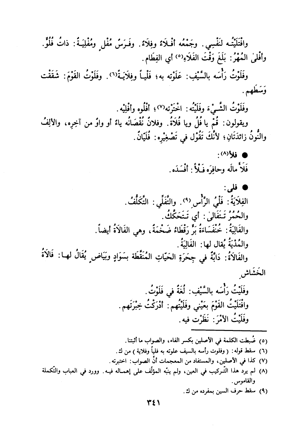 وافْتَلَيْتُه لنَفْسِي . وجَمْعُه أفْلاَءٌ وفِلاَءٌ . وفَرَسٌ مُفْلٍ ومُفْلِيَةٌ : ذاتُ فُلُوٍّ . وأفْلى المُهْرُ : بَلَغَ وَقْتَ الفَلاَءِ أي الفِطَام . وفَلَوْتُ رَأْسَه بالسَّيْفِ : عَلَوْته به ؛ فَلْياً وفِلاَيَةً . وفَلَوْتُ القَوْمَ : شَقَقْت وَسَطَهم . وفَلَوْتُ الشَّيْءَ وفَلَيْتُه : اخْتَرْته ؛ أفْلُوه وأفْلِيْه . ويقولون : قُمْ يا فُلُ ويا فُلاَةُ . وفلانٌ نُقْصَانُه ياءٌ أو واوٌ من آخِرِه ، والألِفُ والنُّونُ زائدَتَانِ ؛ لأنَّكَ تَقُوْل في تَصْغِيْرِه : فُلَيّانٌ . فلأ : فَلأَ مالَه وحافِرَه فَلأً : أفْسَدَه . فلى : الفِلاَيَةُ : فَلْيُ الرَّأْسِ . والتَّفَلِّي : التَّكَلُّفُ . والحُمُرُ تَتَفَالى : أي تَتَحَكَّكُ . والفَالِيَةُ : خُنْفَسَاءَةُ بَرٍّ رَقْطَاءُ ضَخْمَةٌ ، وهي الفَالاَةُ أيضاً . والمُدْيَةُ يُقال لها : الفَالِيَةُ . والفَالاَةُ : دَابَّةٌ في جِحَرَةِ الحَيّاتِ المُنَقَّطَة بسَوَادٍ وبَيَاضٍ يُقَالُ لها : فَالاَةُ الخَشَاشِ . وفَلَيْتُ رَاْسَه بالسَّيْفِ : لُغَةٌ في فَلَوْتُ . وافْتَلَيْتُ القَوْمَ بعَيْني وفَلَيْتُهم : أدْرَكْتُ خِبْرَتَهم . وفَلَيْتُ الأمْرَ : نَظَرْت فيه .
