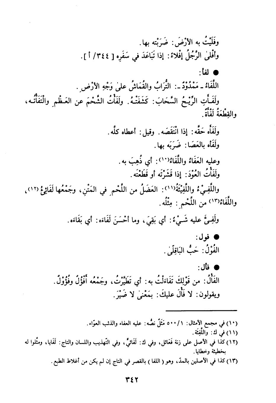 وفَلَيْتُ به الأرْضَ : ضَرَبْته بها . وأفْلى الرَّجُلُ إفْلاءً : إذا تَبَاعَدَ في سَفَرِه . لفأ : اللَّفَاءُ مَمْدُوْدٌ : التُّرَابُ والقُمَاشُ على وَجْهِ الأرْضِ . ولَفَأَتِ الرِّيْحُ السَّحَابَ : كَشَفَتْهُ . ولَفَأْتُ الشَّحْمَ عن العَظْمِ والْتَفَأْتُه ، والقِطْعَةُ لَفْأَةٌ . ولَفَأَه حَقَّه : إذا انْتَقَصَه . وقيل : أعطاه كلَّه . ولَفَأه بالعَصَا : ضَرَبَه بها . وعليه العَفَاءُ واللَّفَاءُ : أي ذُهِبَ به . ولَفَأْتُ العُوْدَ : إذا قَشَرْتَه أو قَطَعْتَه . واللَّفِيْءُ واللَّفِيْئَةُ : العَضَلُ من اللَّحْمِ في المَتْنِ ، وجَمْعُها لَفَائِىءُ ، واللَّفَاءُ من اللَّحْمِ : مِثْلُه . ولَفِىءَ عليه شَيْءٌ : أي بَقِيَ ، وما أحْسَنَ لَفَاءَه : أي بَقَاءَه . فول : الفُوْلُ : حَبُّ البَاقِلّى . فأل : الفَأْلُ : من قَوْلِكَ تَفَاءَلْتُ به : أي تَطَيَّرْتُ ، وجَمْعُه أَفْؤُلٌ وفُؤُوْلٌ . ويقولون : لا فَأْلَ عليكَ : بمَعْنى لا ضَيْرَ .