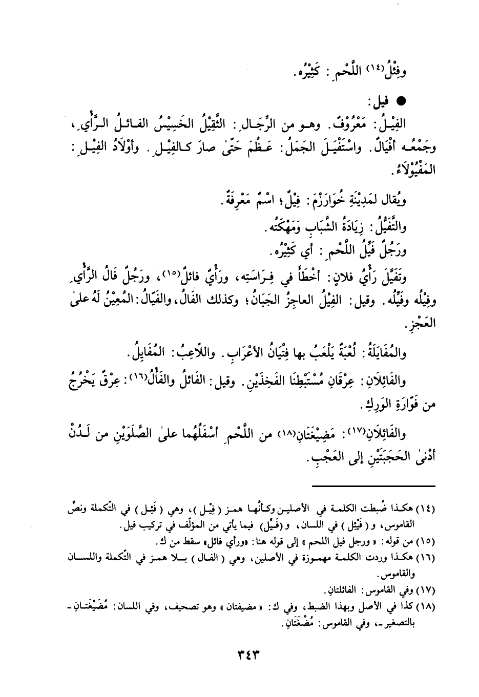 وفِئْلُ اللَّحْمِ : كَثِيْرُه . فيل : الفِيْلُ : مَعْرُوْفٌ . وهو من الرِّجَالِ : الثَّقِيْلُ الخَسِيْسُ الفائلُ الرَّأْيِ ، وجَمْعُه أفْيَالٌ . واسْتَفْيَلَ الجَمَلُ : عَظُمَ حَتّى صارَ كالفِيْلِ . وأوْلاَدُ الفِيْلِ : المَفْيُوْلاَءُ . ويُقال لمَدِيْنَةِ خُوَارَزْمَ : فِيْلٌ ؛ اسْمٌ مَعْرِفَةٌ . والتَّفَيُّلُ : زِيَادَةُ الشَّبَابِ ومَهْكَتُه . ورَجُلٌ فَيِّلُ اللَّحْمِ : أي كَثِيْرُه . وتَفَيَّلَ رَأْيُ فلانٍ : أخْطَأَ في فِرَاسَتِه ، ورَأْيٌ فائلٌ ، ورَجُلٌ فَالُ الرَّأْيِ وفِيْلُه وفَيِّلُه . وقيل : الفِيْلُ العاجِزُ الجَبَانُ ؛ وكذلك الفَالُ ، والفَيّالُ : المُعِيْنُ لَهُ على العَجْزِ . والمُفَايَلَةُ : لُعْبَةٌ يَلْعَبُ بها فِتْيَانُ الأعْرَابِ . واللاّعِبُ : المُفَايِلُ . والفَائِلاَنِ : عِرْقَانِ مُسْتَبْطِنَا الفَخِذَيْنِ . وقيل : الفَائلُ والفَأْلُ : عِرْقٌ يَخْرُجُ من فَوّارَةِ الوَرِكِ . والفَائِلاَنِ : مَضِيْغَتَانِ من اللَّحْمِ أسْفَلُهُما على الصَّلَوَيْنِ من لَدُنْ أدْنى الحَجَبَتَيْنِ إلى العَجْبِ .