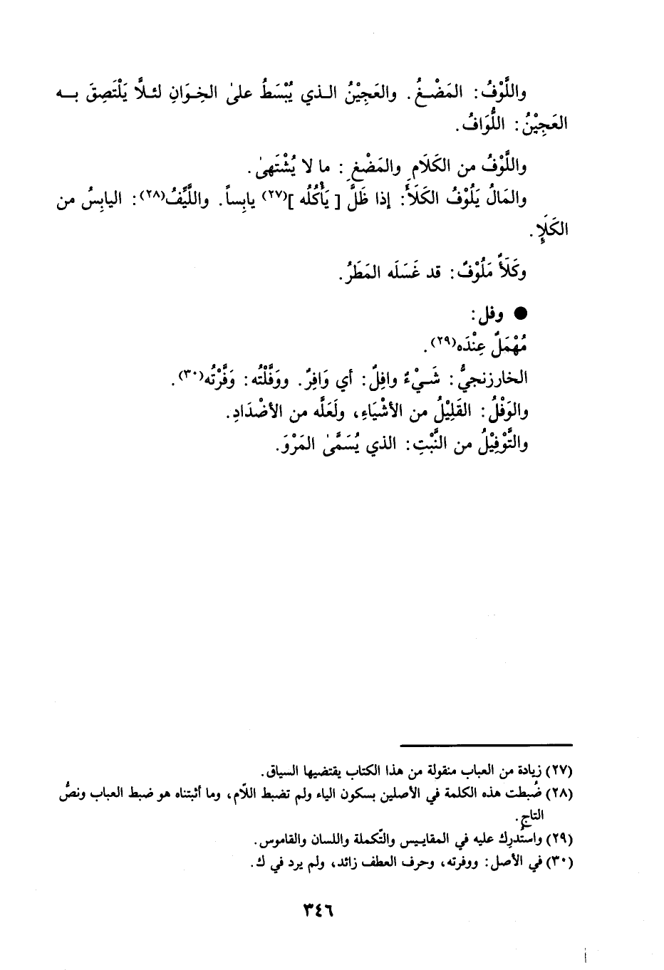 واللَّوْفُ : المَضْغُ . والعَجِيْنُ الذي يُبْسَطُ على الخِوَانِ لئلاَّ يَلْتَصِقَ به العَجِيْنُ : اللُّوَافُ . واللَّوْفُ من الكَلاَمِ والمَضْغِ : ما لا يُشْتَهى . والمالُ يَلُوْفُ الكَلأَ : إذا ظَلَّ يَأْكُلُه يابِساً . واللَّيِّفُ : اليابِسُ من الكَلإِ . وكَلأٌ مَلُوْفٌ : قد غَسَلَه المَطَرُ . وفل : مُهْمَلٌ عِنْدَه . الخارزنجيُّ : شَيْءٌ وافِلٌ : أي وَافِرٌ . ووَفَّلْتُه : وَفَّرْتُه . والوَفْلُ : القَلِيْلُ من الأشْيَاءِ ، ولَعَلَّه من الأضْدَادِ . والتَّوْفِيْلُ من النَّبْتِ : الذي يُسَمَّى المَرْوَ .