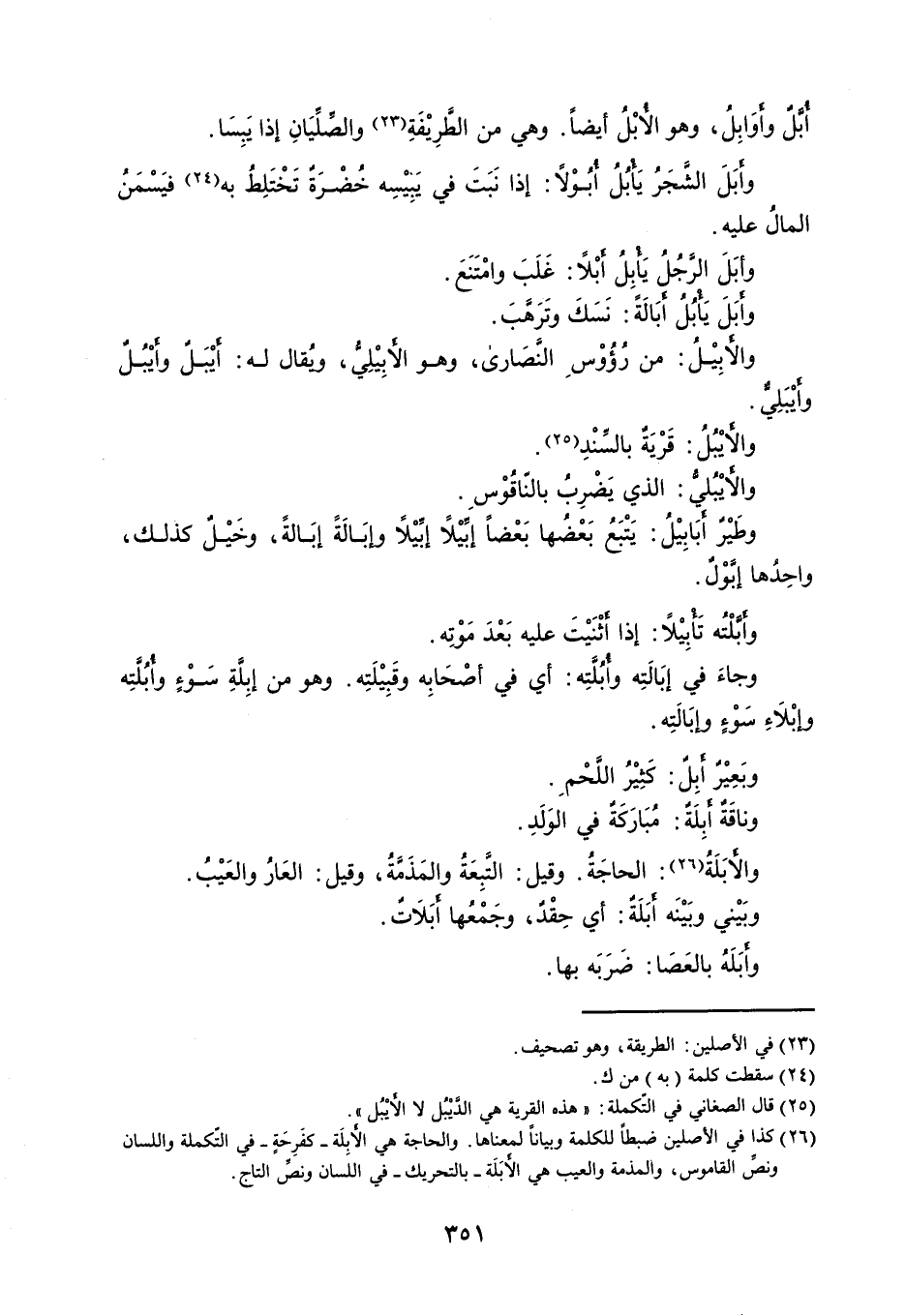 أُبَّلٌ وأَوَابِلُ ، وهو الأُبْلُ أيضاً . وهي من الطَّرِيْفَةِ والصِّلِّيَانِ إذا يَبِسَا . وأَبَلَ الشَّجَرُ يَأْبُلُ أُبُوْلاً : إذا نَبَتَ في يَبِيْسِه خُضْرَةٌ تَخْتَلِطُ به فيَسْمَنُ المالُ عليه . وأبَلَ الرَّجُلُ يَأْبِلُ أَبْلاً : غَلَبَ وامْتَنَعَ . وأَبَلَ يَأْبُلُ أَبَالَةً : نَسَكَ وتَرَهَّبَ . والأَبِيْلُ : من رُؤُوْسِ النَّصَارى ، وهو الأَبِيْلِيُّ ، ويُقال له : أَيْبَلٌ وأَيْبُلٌ وأَيْبَلِيٌّ . والأَيْبُلُ : قَرْيَةٌ بالسِّنْدِ . والأَيْبُليُّ : الذي يَضْرِبُ بالنّاقُوْسِ . وطَيْرٌ أَبَابِيْلُ : يَتْبَعُ بَعْضُها بَعْضاً إبِّيْلاً إبِّيْلاً وإبَالَةً إبَالةً ، وخَيْلٌ كذلك ، واحِدُها إبَّوْلٌ . وأَبَّلْتُه تَأْبِيْلاً : إذا أَثْنَيْتَ عليه بَعْدَ مَوْتِه . وجاءَ في إبَالَتِه وأُبُلَّتِه : أي في أصْحَابِه وقَبِيْلَتِه . وهو من إبِلَّةِ سَوْءٍ وأُبُلَّتِه وإبْلاَءِ سَوْءٍ وإبَالَتِه . وبَعِيْرٌ أَبِلٌ : كَثِيْرُ اللَّحْمِ . وناقَةٌ أَبِلَةٌ : مُبَارَكَةٌ في الوَلَدِ . والأَبَلَةُ : الحاجَةُ . وقيل : التَّبِعَةُ والمَذَمَّةُ ، وقيل : العَارُ والعَيْبُ . وبَيْني وبَيْنَه أَبَلَةٌ : أي حِقْدٌ ، وجَمْعُها أَبَلاَتٌ . وأَبَلَهُ بالعَصَا : ضَرَبَه بها .