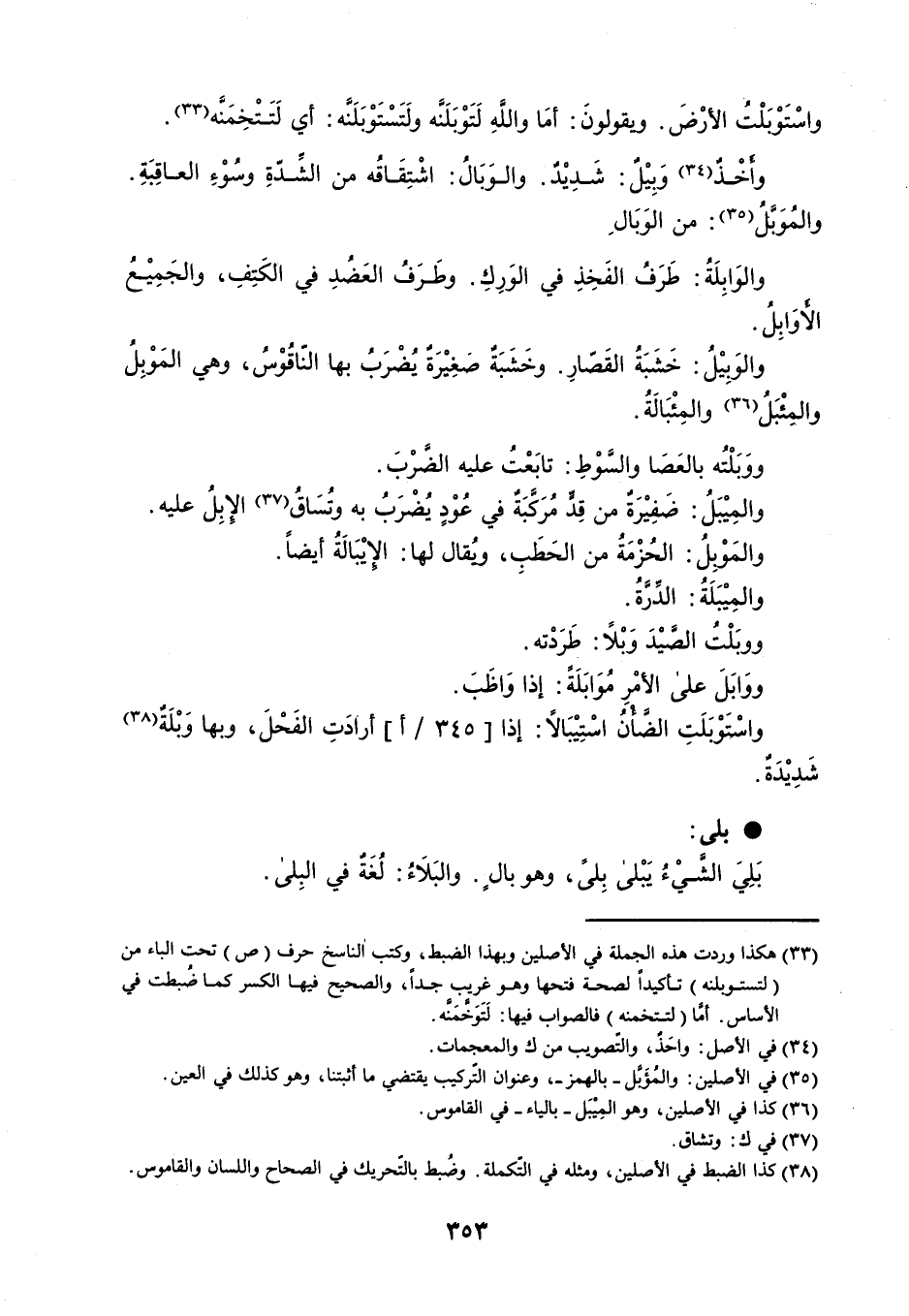 واسْتَوْبَلْتُ الأرْضَ . ويقولونَ : أمَا واللهِ لَتَوْبَلَنَّه ولَتَسْتَوْبَلَنَّه : أي لَتَتْخِمَنَّه . وأَخْذٌ وَبِيْلٌ : شَدِيْدٌ . والوَبَالُ : اشْتِقَاقُه من الشِّدّةِ وسُوْءِ العاقِبَةِ . والمُوَبَّلُ : من الوَبَالِ . والوَابِلَةُ : طَرَفُ الفَخِذِ في الوَرِكِ . وطَرَفُ العَضُدِ في الكَتِفِ ، والجَمِيْعُ الأَوَابِلُ . والوَبِيْلُ : خَشَبَةُ القَصّارِ . وخَشَبَةٌ صَغِيْرَةٌ يُضْرَبُ بها النّاقُوْسُ ، وهي المَوْبِلُ والمِئْبَلُ والمِئْبَالَةُ . ووَبَلْتُه بالعَصَا والسَّوْطِ : تابَعْتُ عليه الضَّرْبَ . والمِيْبَلُ : ضَفِيْرَةٌ من قِدٍّ مُرَكَّبَةٌ في عُوْدٍ يُضْرَبُ به وتُسَاقُ الإِبِلُ عليه . والمَوْبِلُ : الحُزْمَةُ من الَحَطَبِ ، ويُقال لها : الإِيْبَالَةُ أيضاً . والمِيْبَلَةُ : الدِّرَّةُ . ووبَلْتُ الصَّيْدَ وَبْلاً : طَرَدْته . ووَابَلَ على الأمْرِ مُوَابَلَةً : إذا وَاظَبَ . واسْتَوْبَلَتِ الضَّأْنُ اسْتِيْبَالاً : إذا أرادَتِ الفَحْلَ ، وبها وَبْلَةٌ شَدِيْدَةٌ . بلى : بَلِيَ الشَّيْءُ يَبْلى بِلىً ، وهو بالٍ . والبَلاَءُ : لُغَةٌ في البِلى .