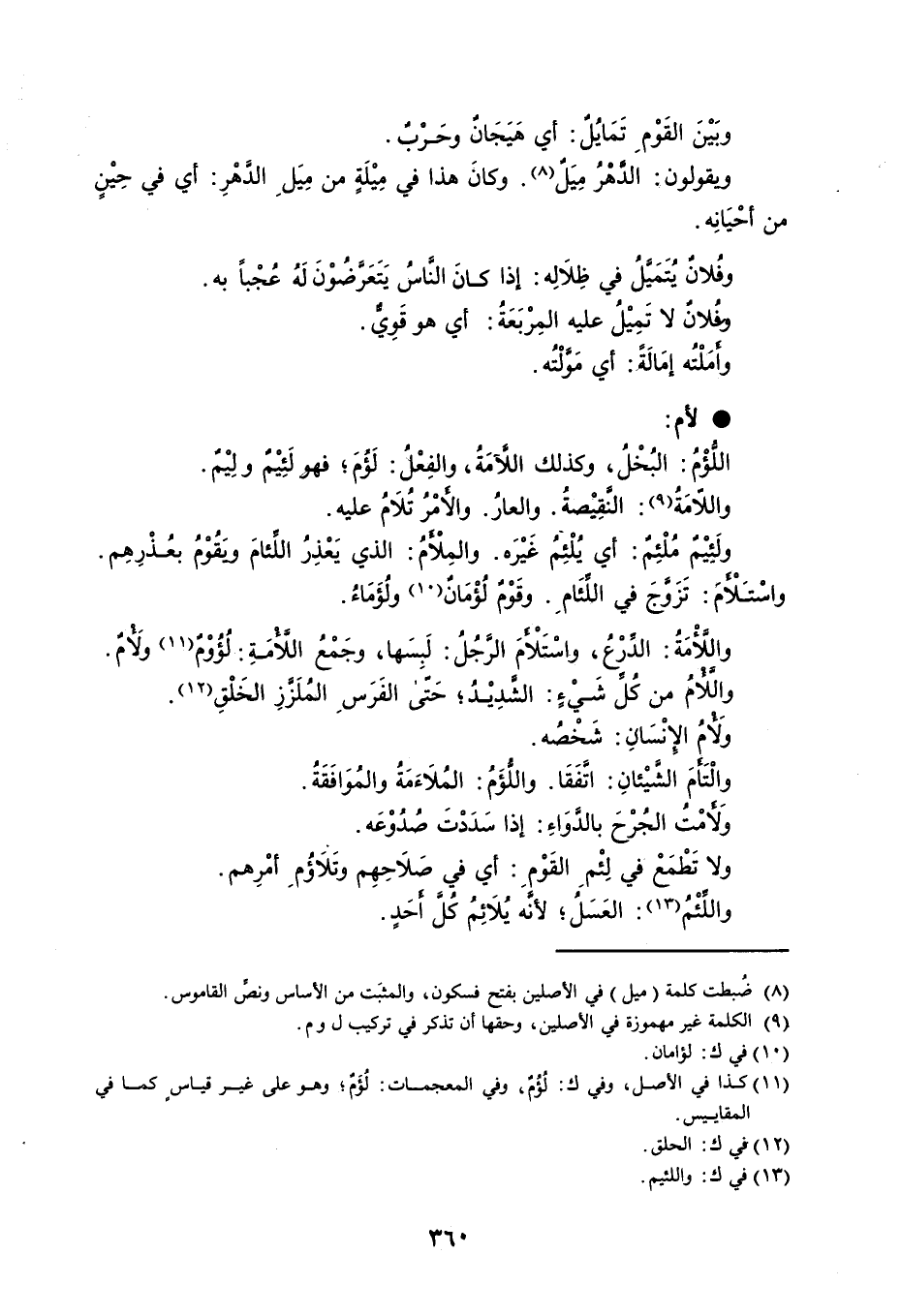 وبَيْنَ القَوْمِ تَمَايُلٌ : أي هَيَجَانٌ وحَرْبٌ . ويقولون : الدَّهْرُ مِيَلٌ . وكانَ هذا في مِيْلَةٍ من مِيَلِ الدَّهْرِ : أي في حِيْنٍِ من أحْيَانِه . وفُلانٌ يُتَمَيَّلُ في ظِلاَلِه : إذا كانَ النَّاسُ يَتَعَرَّضُوْنَ لَهُ عُجْباً به . وفُلانٌ لا تَمِيْلُ عليه المِرْبَعَةُ : أي هو قَوِيٌّ . وأَمَلْتُه إمَالَةً : أي مَوَّلْتُه . لأم : اللُّؤْمُ : البُخْلُ ، وكذلك اللآَّمَةُ ، والفِعْلُ : لَؤُمَ ؛ فهو لَئِيْمٌ ولِيْمٌ . واللاّمَةُ : النَّقِيْصةُ . والعارُ . والأَمْرُ تُلاَمُ عليه . ولَئِيْمٌ مُلْئِمٌ : أي يُلْئِمُ غَيْرَه . والمِلأَمُ : الذي يَعْذِرُ اللِّئامَ ويَقُوْمُ بعُذْرِهِم . واسْتَلأَمَ : تَزَوَّجَ في اللِّئَامِ . وقَوْمٌ لُؤْمَانٌ ولُؤَمَاءُ . واللأْمَةُ : الدِّرْعُ ، واسْتَلأَمَ الرَّجُلُ : لَبِسَها ، وجَمْعُ اللأْمَةِ : لُؤُوْمٌ ولأْمٌ . واللأْمُ من كُلِّ شَيْءٍ : الشَّدِيْدُ ؛ حَتّى الفَرَسِ المُلَزَّزِ الخَلْقِ . ولأْمُ الإِنْسَانِ : شَخْصُه . والْتَأَمَ الشَّيْئانِ : اتَّفَقَا . واللُّؤَمُ : المُلاَءَمَةُ والمُوَافَقَةُ . ولأَمْتُ الجُرْحَ بالدَّوَاءِ : إذا سَدَدْتَ صُدُوْعَه . ولا تَطْمَعْ في لِئْمِ القَوْمِ : أي في صَلاَحِهِم وتَلاَؤُمِ أمْرِهم . واللِّئْمُ : العَسَلُ ؛ لأنَّه يُلاَئِمُ كُلَّ أَحَدٍ .
