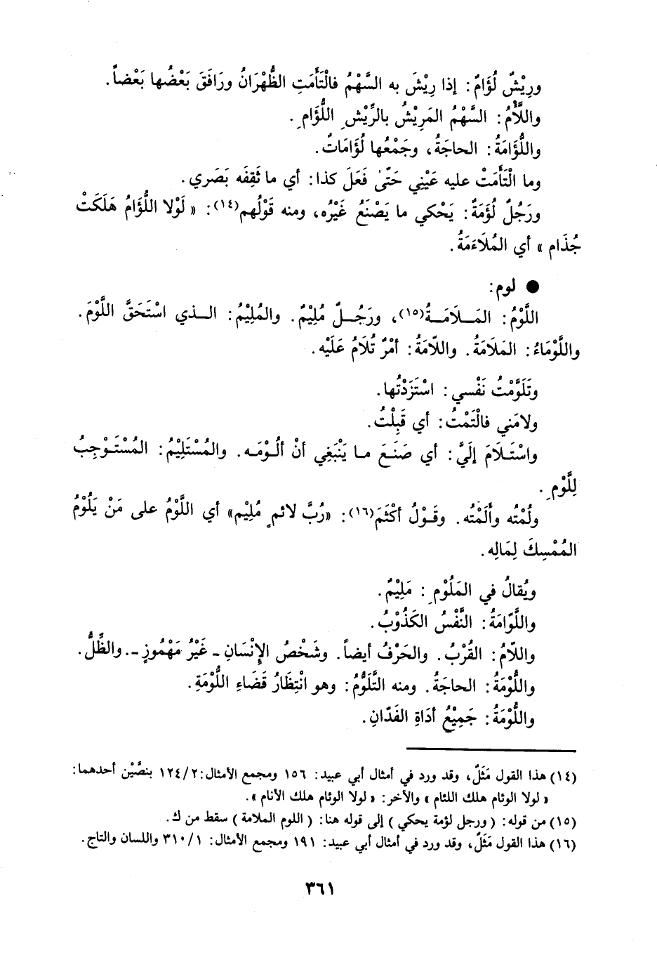 ورِيْشٌ لُؤَامٌ : إذا رِيْشَ به السَّهْمُ فالْتَأَمَتِ الظُّهْرَانُ ورَافَقَ بَعْضُها بَعْضاً . واللأْمُ : السَّهْمُ المَرِيْشُ بالرِّيْشِ اللُّؤَامِ . واللُّؤَامَةُ : الحاجَةُ ، وجَمْعُها لُؤَامَاتٌ . وما الْتَأَمَتْ عليه عَيْنِي حَتّى فَعَلَ كذا : أي ما ثَقِفَه بَصَري . ورَجُلٌ لُؤَمَةٌ : يَحْكي ما يَصْنَعُ غَيْرُه ، ومنه قَوْلُهم : ' لَوْلا اللُّؤَامُ هَلَكَتْ جُذَام ' أي المُلاَءَمَةُ . لوم : اللَّوْمُ : المَلاَمَةُ ، ورَجُلٌ مُلِيْمٌ . والمُلِيْمُ : الذي اسْتَحَقَّ اللَّوْمَ . واللَّوْمَاءُ : المَلاَمَةُ . واللاّمَةُ : أمْرٌ تُلاَمُ عَلَيْه . وتَلَوَّمْتُ نَفْسي : اسْتَزَدْتُها . ولامَني فالْتَمْتُ : أي قَبِلْتُ . واسْتَلاَمَ إلَيَّ : أي صَنَعَ ما يَنْبَغِي أنْ ألُوْمَه . والمُسْتَلِيْمُ : المُسْتَوْجِبُ لِلَّوْمِ . ولُمْتُه وأَلَمْتُه . وقَوْلُ أكْثَمَ : ' رُبَّ لائمٍ مُلِيْم ' أي اللَّوْمُ على مَنْ يَلُوْمُ المُمْسِكَ لِمَالِه . ويُقالُ في المَلُوْمِ : مَلِيْمٌ . واللَّوّامَةُ : النَّفْسُ الكَذُوْبُ . واللاّمُ : القُرْبُ . والحَرْفُ أيضاً . وشَخْصُ الإِنْسَانِ غَيْرُ مَهْمُوزٍ . والظِّلُّ . واللُّوْمَةُ : الحاجَةُ . ومنه التَّلَوُّمُ : وهو انْتِظَارُ قَضَاءِ اللُّوْمَةِ . واللُّوْمَةُ : جَمِيْعُ أدَاةِ الفَدّانِ .