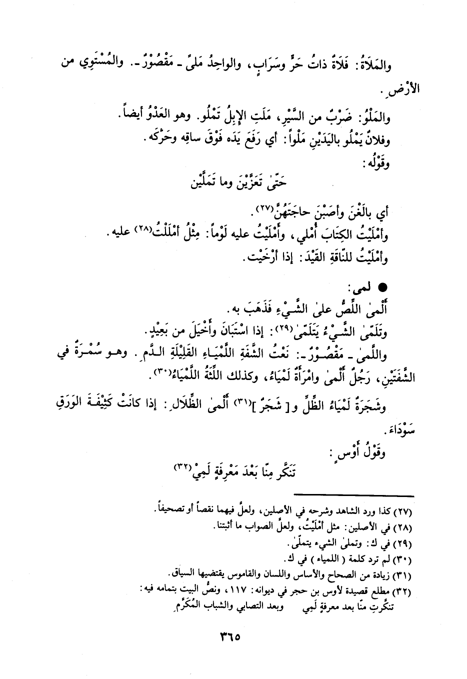 والمَلاَةُ : فَلاَةٌ ذاتُ حَرٍّ وسَرَابٍ ، والواحِدُ مَلىً مَقْصُوْرٌ . والمُسْتَوِي من الأرْضِ . والمَلْوُ : ضَرْبٌ من السَّيْرِ ، مَلَتِ الإِبِلُ تَمْلُو . وهو العَدْوُ أيضاً . وفلانٌ يَمْلُو باليَدَيْنِ مَلْواً : أي رَفَعَ يَدَه فَوْقَ ساقِه وحَرَّكَه . وقَوْلُه : حَتّى تَعَزَّيْنَ وما تَمَلَّيْن أي بالَغْنَ وأصَبْنَ حاجَتَهُنَّ . وأمْلَيْتُ الكِتَابَ أُمْلي ، وأَمْلَيْتُ عليه لَوْماً : مِثْلُ أمْلَلْتُ عليه . وأمْلَيْتُ للنّاقَةِ القَيْدَ : إذا أرْخَيْت . لمى : أَلْمى اللِّصُّ على الشَّيْءِ فَذَهَبَ به . وتَلَمّى الشَّيْءُ يَتَلَمّى : إذا اسْتَبَانَ وأَخْيَلَ من بَعِيْدٍ . واللَّمى مَقْصُوْرٌ : نَعْتُ الشَّفَةِ اللَّمْيَاءِ القَلِيْلَةِ الدَّمِ . وهو سُمْرَةٌ في الشَّفَتَيْنِ ، رَجُلٌ أَلْمى وامْرَأَةٌ لَمْيَاءُ ، وكذلك اللِّثَةُ اللَّمْيَاءُ . وشَجَرَةٌ لَمْيَاءُ الظِّلِّ وشَجَرٌ أَلْمى الظِّلاَلِ : إذا كانَتْ كَثِيْفَةَ الوَرَقِ سَوْدَاءَ . وقَوْلُ أَوْسٍ : تَنَكَّر مِنّا بَعْدَ مَعْرِفَةٍ لَمِيْ
