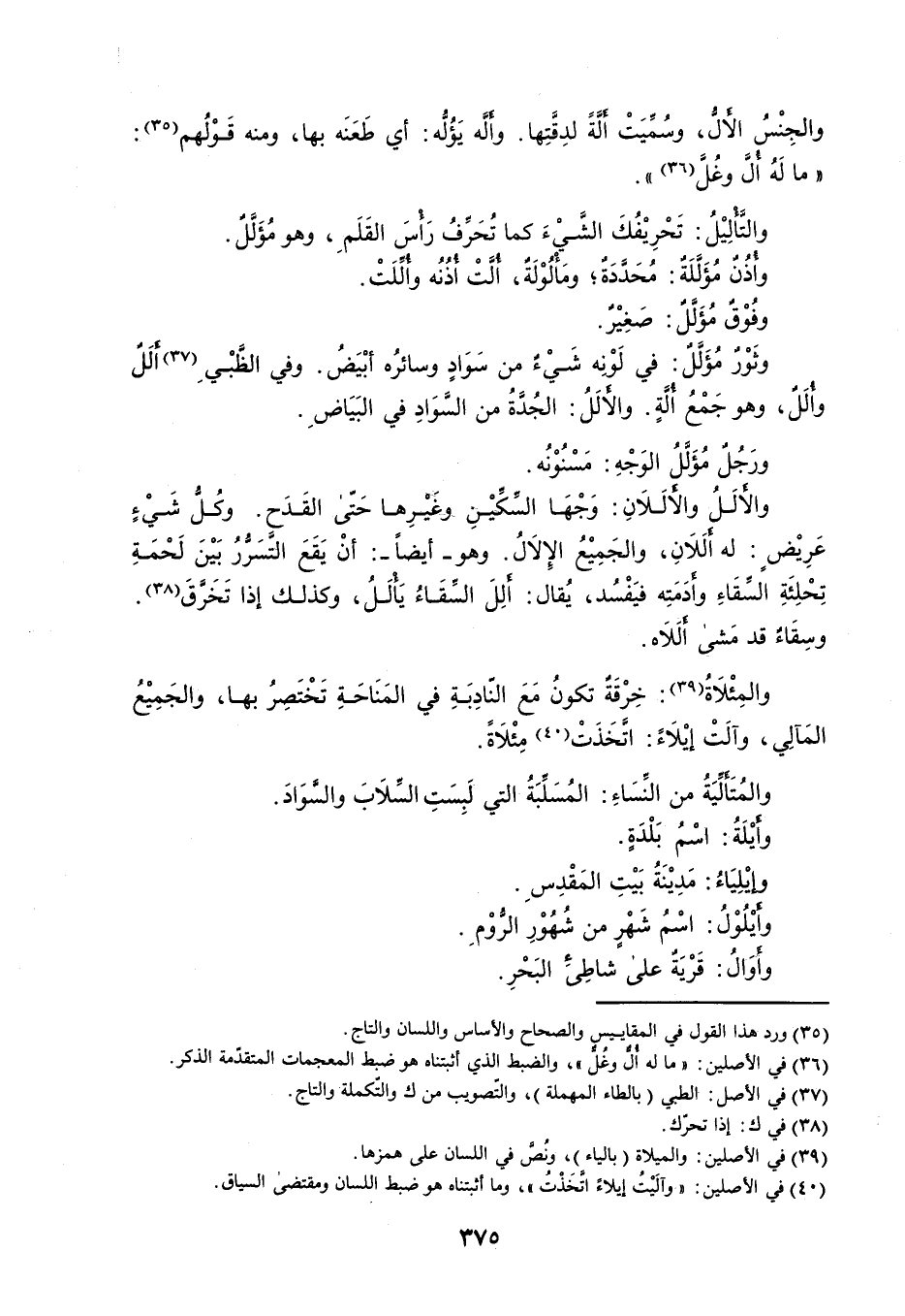 والجِنْسُ الأَلُّ ، وسُمِّيَتْ أَلَّةً لدِقَّتِها . وأَلَّه يَؤُلُّه : أي طَعَنَه بها ، ومنه قَوْلُهم : ' ما لَهُ أُلَّ وغُلَّ ' . والتَّأْلِيْلُ : تَحْرِيْفُكَ الشَّيْءَ كما تُحَرِّفُ رَأْسَ القَلَمِ ، وهو مُؤَلَّلٌ . وأُذُنٌ مُؤَلَّلَةٌ : مُحَدَّدَةٌ ؛ ومَأْلُوْلَةٌ ، أُلَّتْ أُذُنُه وأُلِّلَتْ . وفُوْقٌ مُؤَلَّلٌ : صَغِيْرٌ . وثَوْرٌ مُؤَلَّلٌ : في لَوْنِه شَيْءٌ من سَوَادٍ وسائرُه أبْيَضُ . وفي الظَّبْيِ أَلَلٌ وأُلَلٌ ، وهو جَمْعُ أُلَّةٍ . والأَلَلُ : الجُدَّةُ من السَّوَادِ في البَيَاضِ . ورَجُلٌ مُؤَلَّلُ الوَجْهِ : مَسْنُوْنُه . والأَلَلُ والأَلَلاَنِ : وَجْهَا السِّكِّيْنِ وغَيْرِها حَتّى القَدَح . وكُلُّ شَيْءٍ عَرِيْضٍ : له أَلَلاَنِ ، والجَمِيْعُ الإِلاَلُ . وهو أيضاً : أنْ يَقَعَ التَّسَرُّرُ بَيْنَ لَحْمَةِ تِحْلِئَةِ السِّقَاءِ وأَدَمَتِه فيَفْسُد ، يُقال : أَلِلَ السِّقَاءُ يَأْلَلُ ، وكذلك إذا تَخَرَّقَ . وسِقَاءٌ قد مَشى أَلَلاَه . والمِئْلاَةُ : خِرْقَةٌ تكونُ مَعَ النّادِبَةِ في المَنَاحَةِ تَخْتَصِرُ بها ، والجَمِيْعُ المَآلِي ، وآلَتْ إيْلاَءً : اتَّخَذَتْ مِئْلاَةً . والمُتَأَلِّيَةُ من النِّسَاءِ : المُسَلِّبَةُ التي لَبِسَتِ السِّلاَبَ والسَّوَادَ . وأَيْلَةُ : اسْمُ بَلْدَةٍ . وإيْلِيَاءُ : مَدِيْنَةُ بَيْتِ المَقْدِسِ . وأَيْلُوْلُ : اسْمُ شَهْرٍ من شُهُوْرِ الرُّوْمِ . وأَوَالُ : قَرْيَةٌ على شاطِىءِ البَحْرِ .