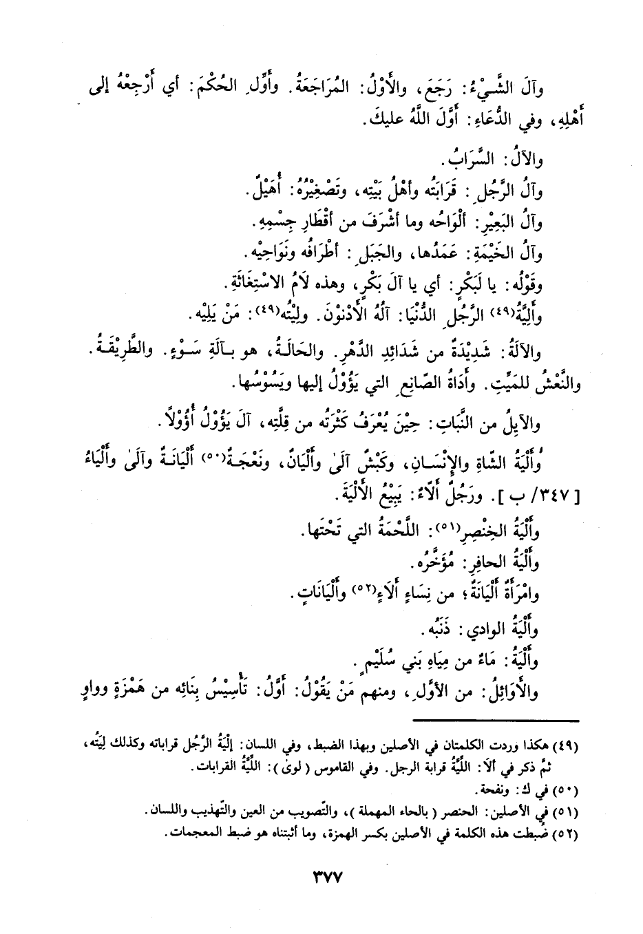 وآلَ الشَّيْءُ : رَجَعَ ، والأَوْلُ : المُرَاجَعَةُ . وأَوِّلِ الحُكْمَ : أي أَرْجِعْهُ إلى أَهْلِهِ ، وفي الدُّعَاءِ : أَوَّلَ اللهُ عليكَ . والآلُ : السَّرَابُ . وآلُ الرَّجُلِ : قَرَابَتُه وأهْلُ بَيْتِه ، وتَصْغِيْرُهُ : أُهَيْلٌ . وآلُ البَعِيْرِ : ألْوَاحُه وما أشْرَفَ من أقْطَارِ جِسْمِهِ . وآلُ الخَيْمَةِ : عَمَدُها ، والجَبَلِ : أطْرَافُه ونَوَاحِيْه . وقَوْلُه : يا لَبَكْرٍ : أي يا آلَ بَكْرٍ ، وهذه لاَمُ الاسْتِغَاثَةِ . وأَلِيَّةُ الرَّجُلِ الدُّنْيَا : آلُهُ الأَدْنوْنَ . ولِيْتُه : مَنْ يَلِيْه . والآلَةُ : شَدِيْدَةق من شَدَائِدِ الدّهْرِ . والحَالَةُ ، هو بآلَةِ سَوْءٍ . والطَّرِيْقَةُ . والنَّعْشُ للمَيِّتِ . وأَدَاةُ الصّانِعِ التي يَؤُوْلُ إليها ويَسُوْسُها . والآيِلُ من النَّبَاتِ : حِيْنَ يُعْرَفُ كَثْرَتُه من قِلَّتِه ، آلَ يَؤُوْلُ أُؤُوْلاً . وأَلْيَةُ الشّاةِ والإِنْسَانِ ، وكَبْشٌ آلَى وأَلْيَانٌ ، ونَعْجَةٌ أَلْيَانَةٌ وآلَى وأَلْيَاءُ . ورَجُلٌ أَلاّءٌ : يَبِيْعُ الأَلْيَةَ . وأَلْيَةُ الخِنْصِرِ : اللَّحْمَةُ التي تَحْتَها . وأَلْيَةُ الحافِرِ : مُؤَخَّرُه . وامْرَأَةٌ أَلْيَانَةٌ ؛ من نِسَاءٍ أَلاَءٍ وأَلْيَانَاتٍ . وأَلْيَةُ الوادي : ذَنَبُه . وأَلْيَةُ : مَاءٌ من مِيَاهِ بَني سُلَيْمٍ . والأَوَائِلُ : من الأوَّلِ ، ومنهم مَنْ يَقُوْلُ : أَوَّلُ : تَأْسِيْسُ بِنَائِه من هَمْزَةٍ وواوٍ
