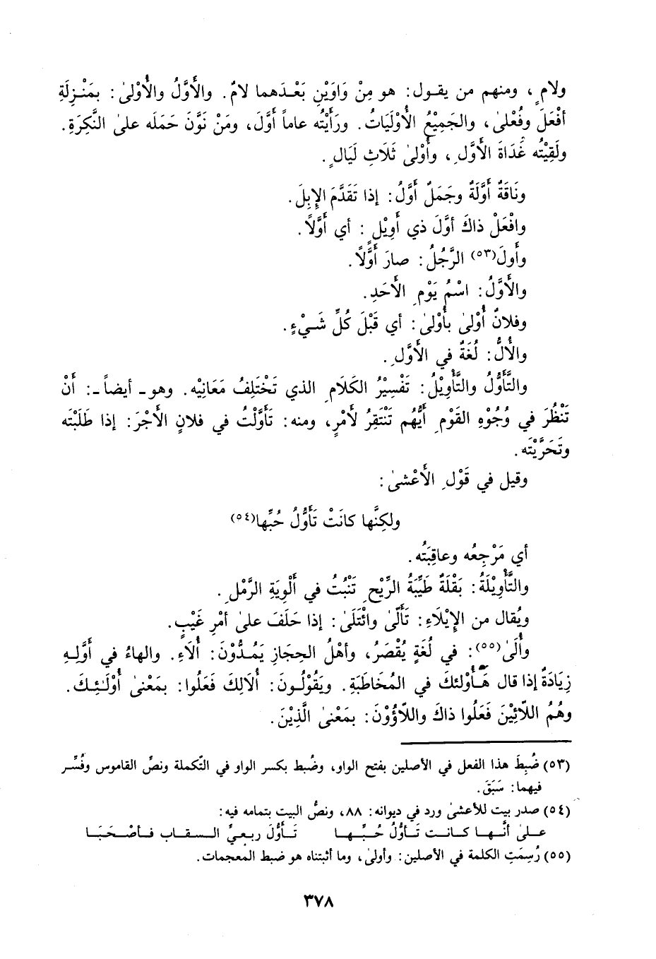 ولامٍ ، ومنهم من يقول : هو مِنْ وَاوَيْنِ بَعْدَهما لامٌ . والأَوَّلُ والأُوْلى : بمَنْزِلَةِ أفْعَلَ وفُعْلى ، والجَمِيْعُ الأُوْلَيَاتُ . ورَأَيْتُه عاماً أَوَّلَ ، ومَنْ نَوَّنَ حَمَلَه على النَّكِرَةِ . ولَقِيْتُه غَدَاةَ الأَوَّلِ ، وأُوْلى ثَلاَثِ لَيَالٍ . ونَاقَةٌ أَوَّلَةٌ وجَمَلٌ أَوَّلُ : إذا تَقَدَّمَ الإِبِلَ . وافْعَلْ ذاكَ أوَّلَ ذي أَوِيْلٍ : أي أَوَّلاً . وأَولَ الرَّجُلُ : صارَ أَوَّلاً . والأَوَّلُ : اسْمُ يَوْمِ الأَحَدِ . وفلانٌ أُوْلى بأُوْلى : أي قَبْلَ كُلِّ شَيْءٍ . والأُلُّ : لُغَةٌ في اَوَّلِ . والتَّأَوُّلُ والتَّأْوِيْلُ : تَفْسِيْرُ الكَلاَمِ الذي تَخْتَلِفُ مَعَانِيْه . وهو أيضاً : أَنْ تَنْظُرَ في وُجُوْهِ القَوْمِ أَيُّهُم تَنْتَقِرُ لأَمْرٍ ، ومنه : تَأَوَّلْتُ في فلانٍ الأَجْرَ : إذا طَلَبْتَه وتَحَرَّيْتَه . وقيل في قَوْلِ الأَعْشى : ولكِنَّها كانَتْ تَأَوُّلُ حُبِّها أي مَرْجِعُه وعاقِبَتُه . والتَّأْوِيْلَةُ : بَقْلَةٌ طَيِّبَةُ الرِّيْحِ تَنْبُتُ في أَلْوِيَةِ الرَّمْلِ . ويُقال من الإِيْلاَءِ : تَأَلّى وائْتَلَى : إذا حَلَفَ على أمْرِ غَيْبٍ . وأُلَى : في لُغَةٍ يُقْصَرُ ، وأهْلُ الحِجَازِ يَمُدُّوْنَ : أُلاَءِ . والهاءُ في أَوَّلِهِ زِيَادَةٌ إذا قال هَأُوْلئكَ في المُخَاطَبَةِ . ويَقُوْلُونَ : أُلاَلِكَ فَعَلُوا : بمَعْنى أُوْلَئِكَ . وهُمُ اللاّئِيْنَ فَعَلُوا ذاكَ واللاّؤُوْنَ : بمَعْنى الَّذِيْنَ .