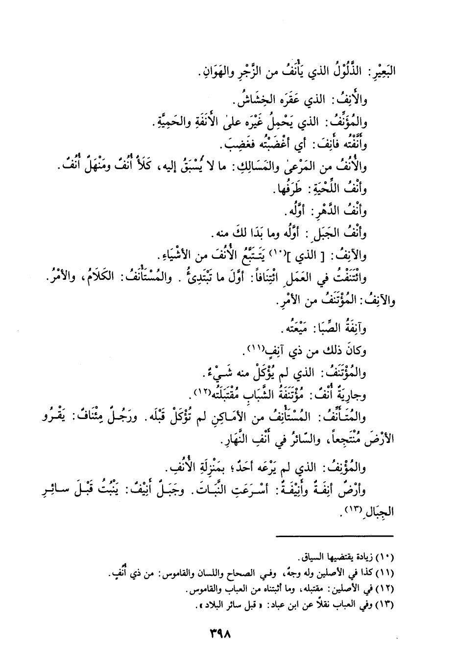 البَعِيْرِ : الذَّلُوْلُ الذي يَأْنَفُ من الزَّجْرِ والهَوَانِ . والأَنِفُ : الذي عَقَرَه الخِشَاشُ . والمُؤَنِّفُ : الذي يَحْمِلُ غَيْرَه على الأَنَفَةِ والحَمِيَّةِ . وأَنَّفْتُه فأَنِفَ : أي أغْضَبْتُه فغَضِبَ . والأُنُفُ من المَرْعى والمَسَالِكِ : ما لا يَسْبَقُ إليه ، كَلأٌ أُنُفٌ ومَنْهَلٌ أُنُفٌ . وأنْفُ اللِّحْيَةِ : طَرَفُها . وأنْفُ الدَّهْرِ : أَوَّلُه . وأنْفُ الجَبَلِ : أوَّلُه وما بَدَا لكَ منه . والآنِفُ : الذي يَتَتَبَّعُ الأُنُفَ من الأشْيَاءِ . وائْتَنَفْتُ في العَمَلِ ائْتِنَافاً : أوَّلَ ما تَبْتَدِىءُ . والمُسْتَأْنَفُ : الكَلاَمُ ، والأمْرُ . والآنِفُ : المُؤْتَنَفُ من الأمْرِ . وآنِفَةُ الصِّبَا : مَيْعَتُه . وكانَ ذلك من ذي آنِفٍ . والمُؤْتَنَفُ : الذي لم يُؤْكَلْ منه شَيْءٌ . وجارِيَةٌ أُنْفٌ : مُؤْتَنَفَةُ الشَّبَابِ مُقْتَبَلَتُه . والمُتَأَنِّفُ : المُسْتَأْنِفُ من الأمَاكِنِ لم تُؤْكَلْ قَبْلَه . ورَجُلٌ مِئْنَافٌ : يَقْرُو الأرْضَ مُنْتَجِعاً ، والسّائرُ في أَنْفِ النَّهَارِ . والمُؤْنِفُ : الذي لم يَرْعَه أحَدٌ ؛ بمَنْزِلَةِ الأُنُفِ . وأرْضٌ أنِفَةٌ وأَنِيْفَةٌ : أسْرَعَتِ النَّبَاتَ . وجَبَلٌ أَنِيْفٌ : يَنْبُتُ قَبْلَ سائِرِ الجِبَالِ .