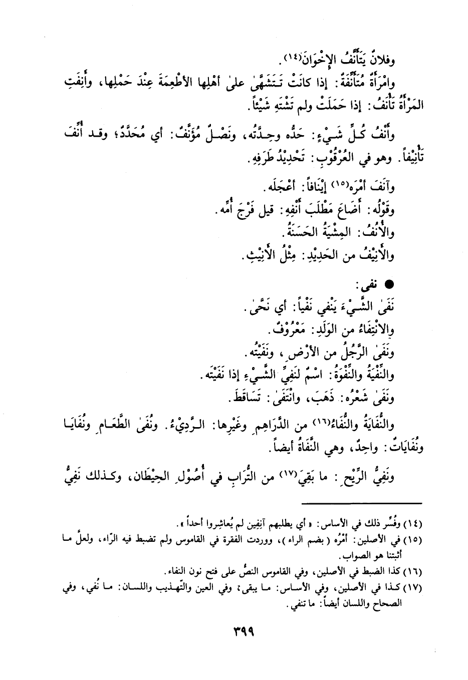 وفلانٌ يَتَأَنَّفُ الإِخْوَانَ . وامْرَأَةٌ مُتَأَنِّفَةٌ : إذا كانَتْ تَتَشَهَّى على أهْلِها الأطْعِمَةَ عِنْدَ حَمْلِها ، وأَنِفَتِ المَرْأَةُ تَأْنَفُ : إذا حَمَلَتْ ولم تَشْتَهِ شَيْئاً . وأَنْفُ كُلِّ شَيْءٍ : حَدُّه وحِدَّتُه ، ونَصْلٌ مُؤَنَّفٌ : أي مُحَدَّدٌ ؛ وقد أُنِّفَ تَأْنِيْفاً . وهو في العُرْقُوْبِ : تَحْدِيْدُ طَرَفِهِ . وآنَفَ أمْرَه إيْنَافاً : أعْجَلَه . وقَوْلُه : أَضَاعَ مَطْلَبَ أَنْفِهِ : قيل فَرْجَ أُمِّه . والأُنُفُ : المِشْيَةُ الحَسَنَةُ . والأَنِيْفُ من الحَدِيْدِ : مِثْلُ الأَنِيْثِ . نفى : نَفَى الشَّيْءَ يَنْفي نَفْياً : أي نَحَّى . والانْتِفَاءُ من الوَلَدِ : مَعْرُوْفٌ . ونَفَى الرَّجُلُ من الأرْضِ ، ونَفَيْتُه . والنِّفْيَةُ والنِّفْوَةُ : اسْمٌ لنَفِيِّ الشَّيْءِ إذا نَفَيْتَه . ونَفَى شَعْرُه : ذَهَبَ ، وانْتَفَى : تَسَاقَطَ . والنُّفَايَةُ والنُّفَاءُ من الدَّرَاهِمِ وغَيْرِها : الرَّدِيْءُ . ونُفَى الطَّعَامِ ونُفَايَا ونُفَايَاتٌ : واحِدٌ ، هي النَّفَاةُ أيضاً . ونَفِيُّ الرِّيْحِ : ما بَقِيَ من التُّرَابِ في أُصُوْلِ الحِيْطَان ، وكذلك نَفِيُّ