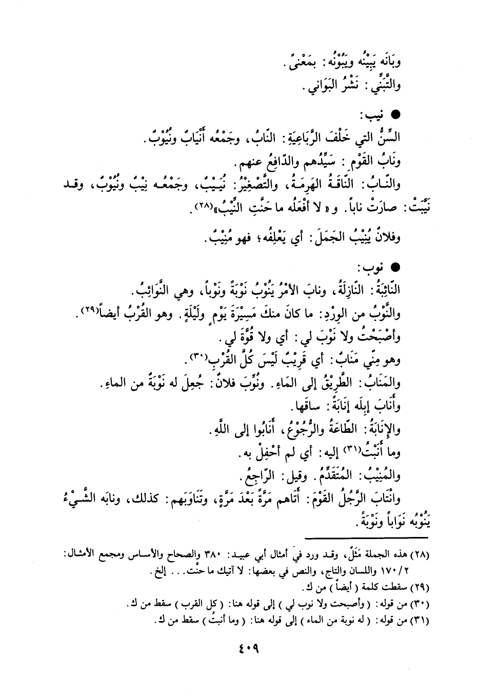 وبَانَه يَبِيْنُه ويَبُوْنُه : بمَعْنىً . والتَّبَنِّي : نَشْرُ البَوَاني . نيب : السِّنُّ التي خَلْفَ الرَّبَاعِيَةِ : النّابُ ، وجَمْعُه أَنْيَابٌ ونُبُوْبٌ . ونَابُ القَوْمِ : سَيِّدُهم والدّافِعُ عنهم . والنّابُ : النّاقَةُ الهَرِمَةُ ، والتَّصْغِيْرُ : نُيَيْبٌ ، وجَمْعُه نِيْبٌ ونُبُوْبٌ ، وقد نَيَّبَتْ : صارَتْ ناباً . و ' لا أفْعَلُه ما حَنَّتِ النِّيْبُ ' . وفلانٌ يُنِيْبُ الجَمَلَ : أي يَعْلِفُه ؛ فهو مُنِيْبٌ . نوب : النّائِبَةُ : النّازِلَةُ ، ونابَ الأمْرُ يَنُوْبُ نَوْبَةً ونَوْباً ، وهي النَّوَائِبُ . والنَّوْبُ من الوِرْدِ : ما كانَ منكَ مَسِيْرَةَ يَوْمٍ ولَيْلَةٍ . وهو القُرْبُ أيضاً . وأصْبَحْتُ ولا نَوْبَ لي : أي ولا قُوَّةَ لي . وهو مِنّي مَنَابٌ : أي قَرِيْبٌ لَيْسَ كُلَّ القُرْبِ . والمَنَابُ : الطَّرِيْقُ إلى المَاءِ . ونُوِّبَ فلانٌ : جُعِلَ له نَوْبَةٌ من الماءِ . وأَنَابَ إبِلَه إنَابَةً : ساقَها . والإِنَابَةُ : الطّاعَةُ والرُّجُوْعُ ، أَنَابُوا إلى اللهِ . وما أَنَبْتُ إليه : أي لم أحْفِلْ به . والمُنِيْبُ : المُتَقَدِّمُ . وقيل : الرّاجِعُ . وانْتَابَ الرَّجُلُ القَوْمَ : أَتَاهم مَرَّةً بَعْدَ مَرَّةٍ ، وتَنَاوَبَهم : كذلك ، ونابَه الشَّيْءُ يَنُوْبُه نَوَاباً ونَوْبَةً .