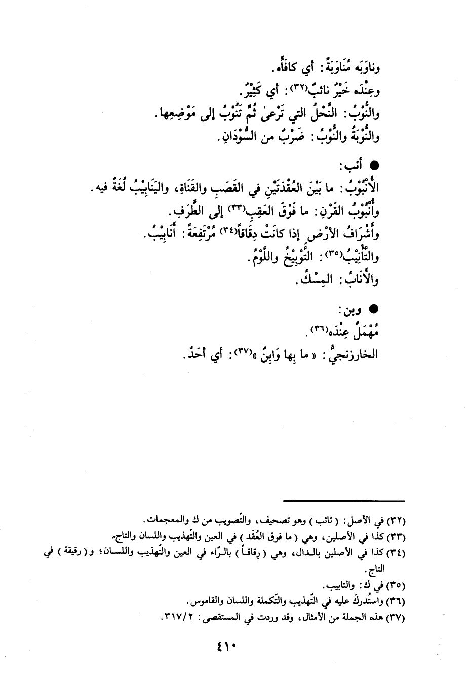 وناوَبَه مُنَاوَبَةً : أي كافَأَه . وعِنْدَه خَيْرٌ نائبٌ : أي كَثِيْرٌ . والنُّوْبُ : النَّحْلُ التي تَرْعى ثُمَّ تَنُوْبُ إلى مَوْضِعِها . والنُّوْبَةُ والنُّوْبُ : ضَرْبٌ من السُّوْدَانِ . أنب : الأُنْبُوْبُ : ما بَيْنَ العُقْدَتَيْنِ في القَصَبِ والقَنَاةِ ، واليَنَابِيْبُ لُغَةٌ فيه . وأُنْبُوْبُ القَرْنِ : ما فَوْقَ العَقِبِ إلى الطَّرَفِ . وأَشْرَافُ الأرْضِ إذا كانَتْ دِقَاقاً مُرْتَفِعَةً : أَنَابِيْبُ . والتَّأْنِيْبُ : التَّوْبِيْخُ واللَّوْمُ . والأَنَابُ : المِسْكُ . وبن : مُهْمَلٌ عِنْدَه . الخارزنجيُّ : ' ما بِها وَابْنٌ ' : أي أحَدٌ .