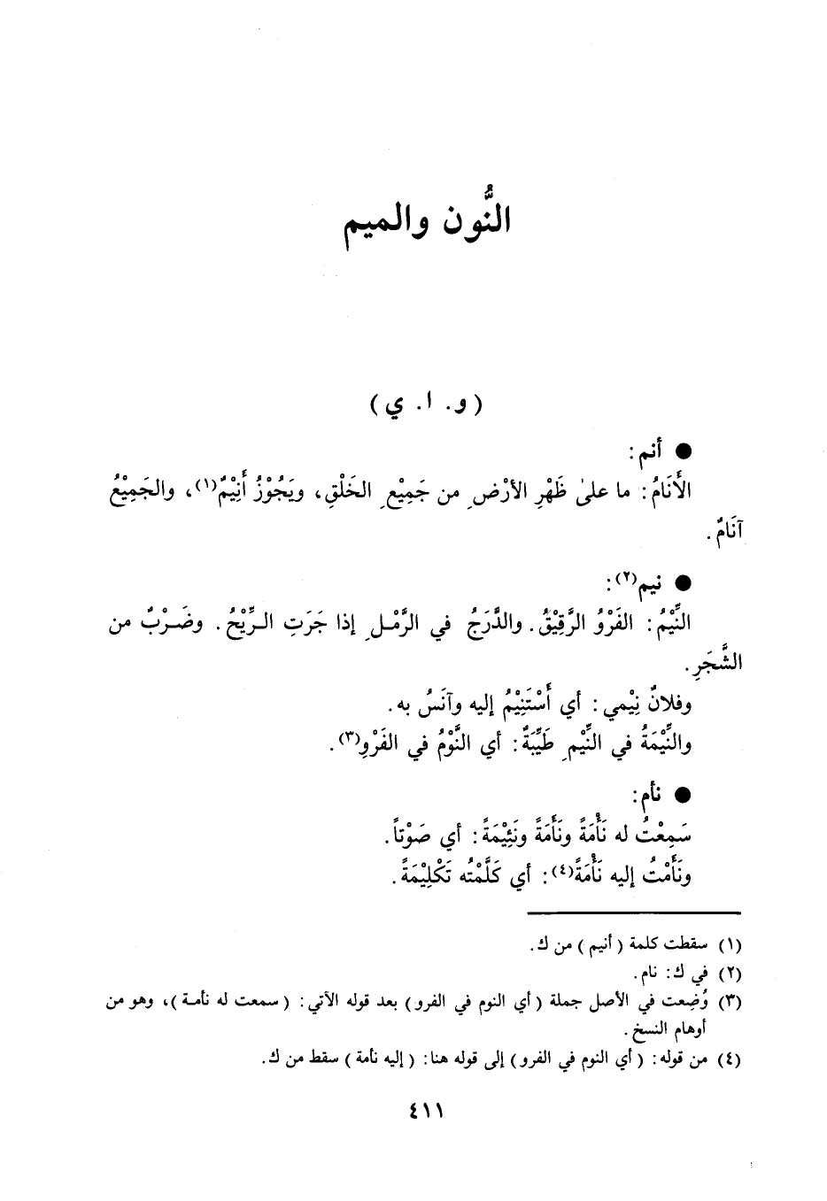 أنم : الأَنَامُ : ما على ظَهْرِ الأرْضِ من جَمِيْعِ الخَلْقِ ، ويَجُوْزُ أَنِيْمٌ ، والجَمِيْعُ آنَامٌ . نيم : النِّيْمُ : الفَرْوُ الرَّقِيْقُ . والدَّرَجُ في الرَّمْلِ إذا جَرَتِ الرِّيْحُ . وضَرْبٌ من الشَّجَرِ . وفلانٌ نِيْمي : أي أَسْتَنِيْمُ إليه وآنَسُ به . والنِّيْمَةُ في النِّيْمِ طَيِّبَةٌ : أي النَّوْمُ في الفَرْوِ . نأم : سَمِعْتُ له نَأْمَةً ونَأَمَةً ونَئِيْمَةً : أي صَوْتاً . ونَأَمْتُ إليه نَأْمَةً : أي كَلَّمْتُه تَكْلِيْمَةً .