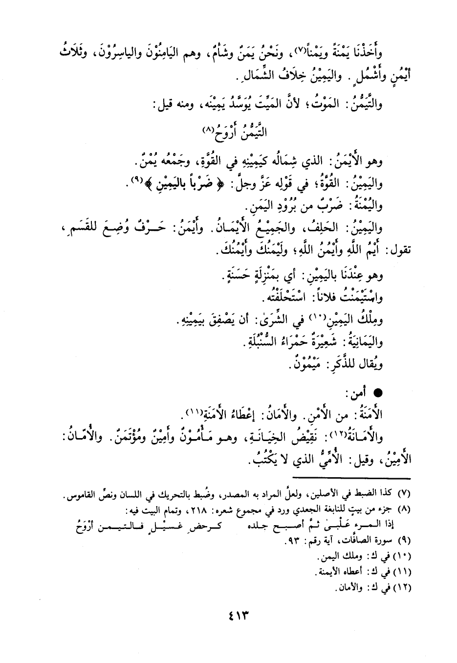 وأَخَذْنَا يَمْنَةً ويَمْناً ، ونَحْنُ يَمَنٌ وشَأمٌ ، وهم اليَامِنُوْنَ والياسِرُوْنَ ، وثَلاَثُ أيْمُنٍ وأَشْمُلٍ . واليَمِيْنُ خِلاَفُ الشِّمَالِ . والتَّيَمُّنُ : المَوْتُ ؛ لأنَّ المَيِّتَ يُوَسَّدُ يَمِيْنَه ، ومنه قيل : التَّيَمُّنُ أَرْوَحُ وهو الأَيْمَنُ : الذي شِمَالُه كيَمِيْنِهِ في القُوَّةِ ، وجَمْعُه يُمْنٌ . واليَمِيْنُ : القُوَّةُ ؛ في قَوْلِه عَزَّ وجلَّ : ' ضَرْباً باليَميْنِ ' . واليُمْنَةُ : ضَرْبٌ من بُرُوْدِ اليَمَنِ . واليَمِيْنُ : الحَلِفُ ، والجَمِيْعُ الأَيْمَانُ . وأَيْمَنُ : حَرْفٌ وُضِعَ للقَسَمِ ، تقول : أَيْمُ اللهِ وأَيْمُنُ اللهِ ؛ ولَيْمَنُكَ وأَيْمُنُكَ . وهو عِنْدَنَا باليَمِيْنِ : أي بمَنْزِلَةٍ حَسَنَةٍ . واسْتَيْمَنْتُ فلاناً : اسْتَحْلَفْتُه . ومِلْكُ اليَمِيْنِ في الشِّرَى : أن يَصْفِقَ بيَمِيْنِهِ . واليَمَانِيَةُ : شَعِيْرَةٌ حَمْراءُ السُّنْبُلَةِ . ويُقال للذَّكَرِ : مَيْمُوْنٌ . أمن : الأَمَنَةُ : من الأَمْنِ . والأَمَانُ : إعْطَاءُ الأَمَنَةِ . والأَمَانَةُ : نَقِيْضُ الخِيَانَةِ ، وهو مَأْمُوْنٌ وأَمِيْنٌ ومُؤْتَمَنٌ . والأُمّانُ : الأَمِيْنُ ، وقيل : الأُمِّيُّ الذي لا يَكْتُبُ .