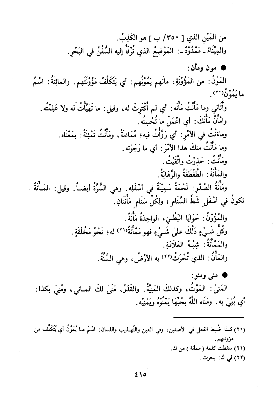 من المَيْنِ الذي هو الكَذِبُ . والمِيْنَاءُ مَمْدُوْدٌ : المَوْضِعُ الذي تُرْفَأُ إليه السُّفُنُ في البَحْرِ . مون ومأن : المَوْنُ : من المَؤُوْنَةِ ، مانَهم يَمُوْنُهم : أي يَتَكَلَّفُ مَؤُوْنَتَهم . والمائِنَةُ : اسْمُ ما يَمُوْنُ . وأَتَاني وما مَأَنْتُ مَأْنَه : أي لم أَكْتَرِثْ له ، وقيل : ما تَهَيَّأْتُ له ولا عَلِمْتُه . وامْأَنْ مَأْنَكَ : أي اعْمَلْ ما تُحْسِنُه . ماءَنْتُ في الأمْرِ : أي رَوَّأْتُ فيه ؛ مُمَاءَنَةً ، ومَأَّنْتُ تَمْئِنَةً : بمَعْنَاه . وما مَأَنْتُ منكَ هذا الأمْرَ : أي ما رَجَوْته . ومَأَنْتُ : حَذِرْتُ واتَّقَيْتُ . والمَأْنَةُ : الطَّفْطَفَةُ والرَّهَابَةُ . ومَأْنَةُ الصَّدْرِ : لَحْمَةٌ سَمِيْنَةٌ في أسْفَلِه . وهي السُّرَّةُ أيضاً . وقيل : المَأْنَةُ تكونُ في أسْفَلِ شَطِّ السَّنَامِ ؛ ولكُلِّ سَنَامٍ مَأْنَتَانِ . والمُؤُوْنُ : حَوَايَا البَطْنِ ، الواحِدَةُ مَأْنَةٌ . وكُلُّ شَيْءٍ دَلَّكَ على شَيْءٍ فهو مَمْأَنَةٌ له ؛ نَحْوُ مَخْلَقَةٍ . والمَمْأَنَةُ : شِبْهُ العَلاَمَةِ . والمَأْنُ : الذي تُحْرَثُ به الأرْضُ ، وهي السِّنَّةُ . منى ومنو : المَنى : المَوْتُ ، وكذلكَ المَنِيَّةُ . والقَدَرُ ، مَنَى لكَ الماني ، ومُنِيَ بكذا : أي بُلِيَ به . ومَنَاه اللهُ بحُبِّهَا يَمْنُوْهُ ويَمْنِيْه .