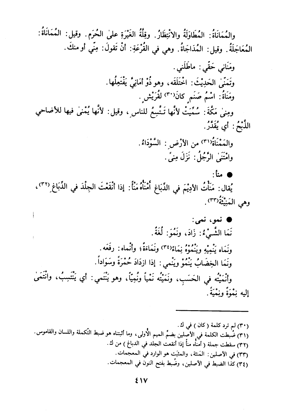 والمُمَانَاةُ : المُطَاوَلَةُ والانْتِظَارُ . وقِلَّةُ الغَيْرَةِ على الحُرَم . وقيل : المُمَانَاةُ : المُعَاجَلَةُ . وقيل : المُدَاجَاةُ . وهي في القُرْعَةِ : أنْ تَقولَ : مِنّي أو منكَ . ومَنَاني حَقّي : ماطَلَني . وتَمَنّى الحَدِيْثَ : اخْتَلَقَه ، وهو ذُوْ أمَانِيَّ يَفْتَعِلُها . ومَنَاةُ : اسْمُ صَنَمٍ كانَ لقُرَيْشٍ . ومِنى مَكَّةَ : سُمِّيَتْ لأنَّها تَتَّسِعُ للناسِ ، وقيل : لأنَّها يُمْنى فيها للأضاحي الذَّبْحُ : أي يُقَدَّرُ . والمَمْنَاةُ من الأرْضِ : السَّوْدَاءُ . وامْتَنَى الرَّجُلُ : نَزَلَ مِنىً . منأ : يُقال : مَنَأْتُ الأدِيْمَ في الدِّبَاغ أَمْنَأُهُ مَنْأً : إذا أنْقَعْتَ الجِلْدَ في الدِّبَاغِ ، وهي المَنِيْئَةُ . نمو ، نمى : نَمَا الشَّيْءُ : زَادَ ، ونَمُوَ : لُغَةٌ . ونَمَاه يَنْمِيْهِ ويَنْمُوْهُ نِمَاءً ونَمَاءَةً ؛ وأنْماه : رفَعَه . ونَمَا الخِضَابُ يَنْمُوْ ويَنْمي : إذا ازدَادَ حُمْرَةً وسَوَاداً . وأنْمَيْتُه في الحَسَبِ ، ونَمَيْتُه نَمْياً ونُمِيّاً ، وهو يَنْتَمي : أي يَنْتَسِبُ ، وانْتَمَى إليه نِمْوَةً ونِمْيَةً .